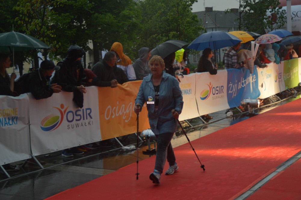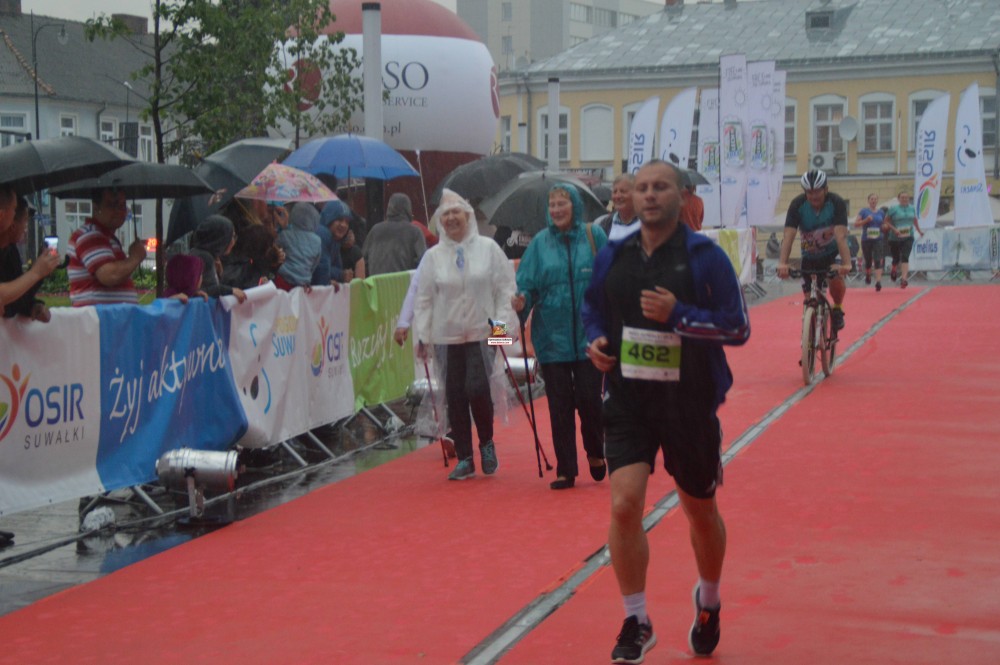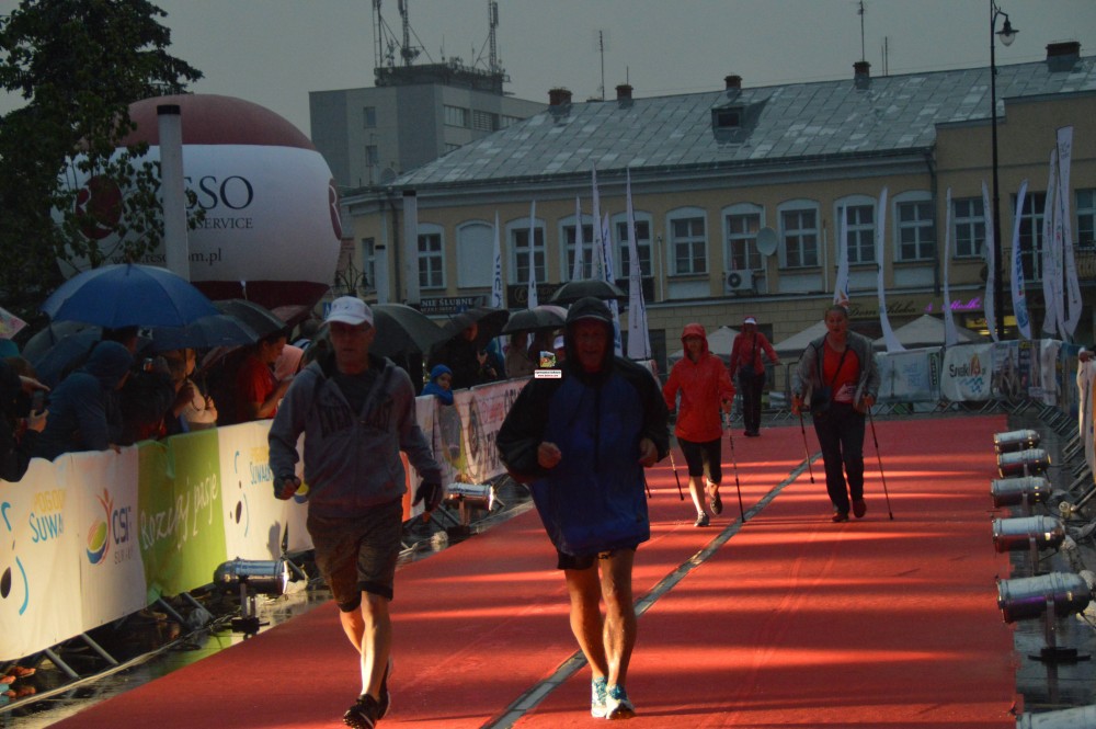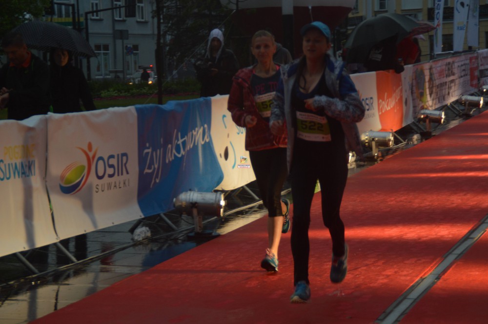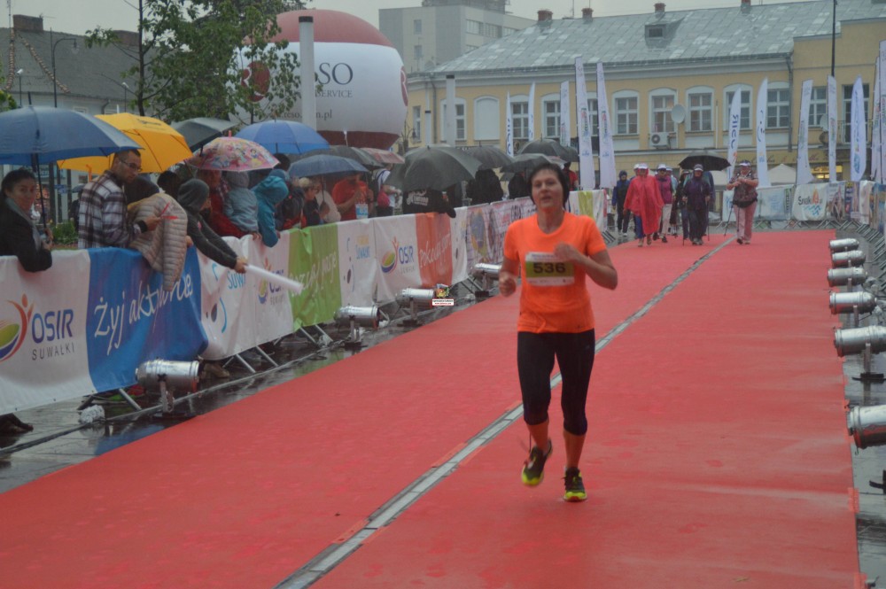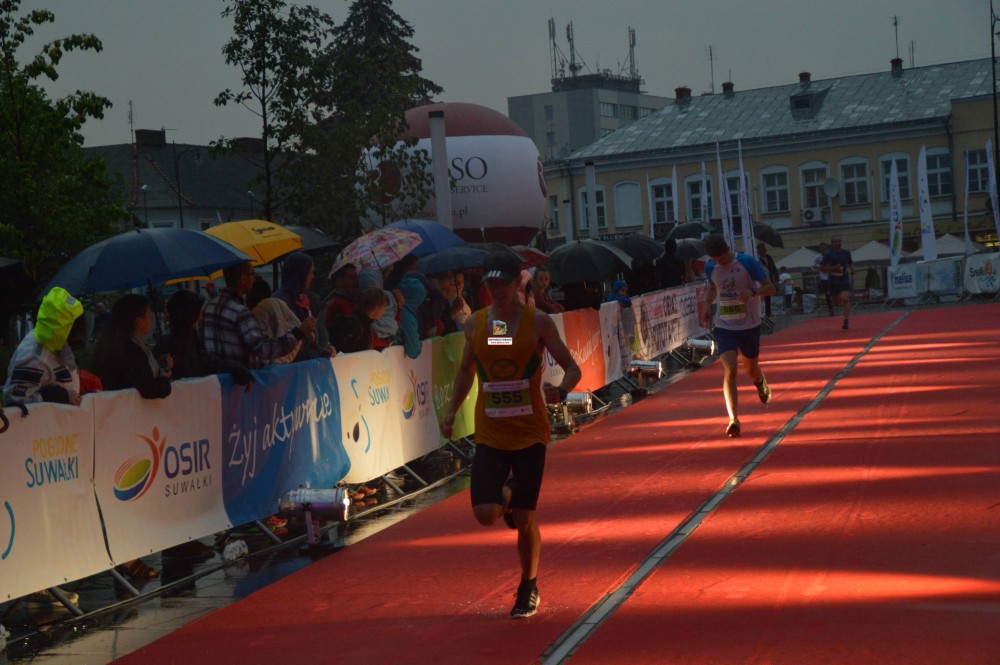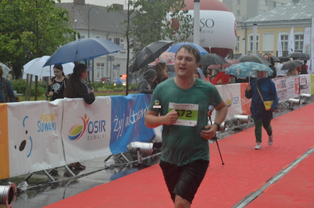Pecha mieli uczestnicy wyznaczonego na godz. 20.00 biegu na 3,5 kilometra - Suwalskie Debiuty. Blisko stu biegaczy i drugie tyle towarzyszących im w Suwalskim Marszu im z kijkami nordic walking emerytów zmoczył deszcz.