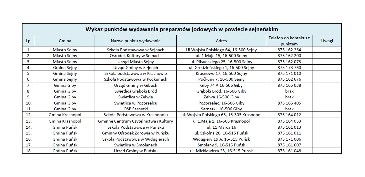 Starostwo Powiatowe w Sejnach opublikowało wykaz punktów wydawania preparatów jodowych. Przygotowanie tabletek z jodkiem potasu to standardowa procedura, przewidziana w przepisach prawa i stosowana na wypadek wystąpienia ewentualnego zagrożenia radiacyjnego.