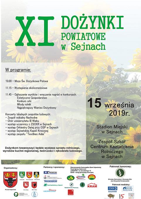 Starosta Sejneński serdecznie zaprasza do udziału w XI Dożynkach Powiatu Sejneńskiego, które odbędą się w Sejnach w dniu 15 września 2019 r. (niedziela). Początek o godz. 10.00.