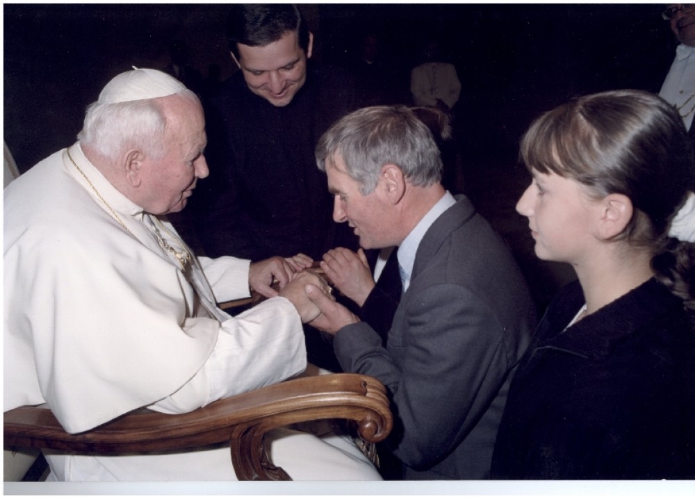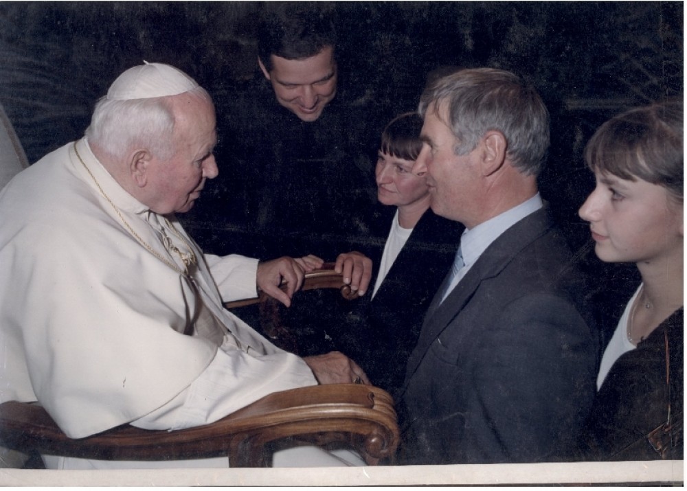 Staliśmy niemal na końcu tego sznura delegacji. Wcześniej uprzedzono nas, żeby nic Ojcu Świętemu nie podawać, nie wygłaszać mów, tylko jedno-dwa zdania i wszystko. Kiedy podeszliśmy, przyklękliśmy przed Janem Pawłem II nie wytrzymałem. Powiedziałem: Ojcze Święty, ziemia wigierska pozdrawia Cię. A on ożywił się, z jego twarzy zniknęło gdzieś widoczne wcześniej zmęczenie, w oczach pojawił się błysk, uniósł się i odpowiedział: Pamiętam, pamiętam. Pływałem tam, odwiedziłem wasz dom, a tu jesteście z córką. Położył mi dłoń na lewym ramieniu. Jeszcze raz ucałowaliśmy jego dłoń i już były przy nas służby porządkowe, które uznały, że za długo zajmujemy czas Ojca Świętego. Moment naszego spotkania uchwycił i utrwalił osobisty fotograf papieża Arturo Mari. Było to nasze drugie i ostatnie spotkanie z Janem Pawłem II.