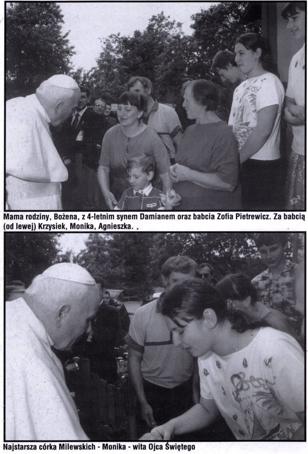 St. Milewski: Rzeczywiście nie było nam dane zobaczyć Ojca Świętego nawet w czasie przejazdu przez miasto. Nie doczekaliśmy tej chwili, popędziliśmy na pociąg, którego odjazd opóźniono o godzinę. Wówczas w domu została babcia, najmłodszy, 4-letni Damianek i „na ochotnika” najstarsza córka 17-letnia Monika.