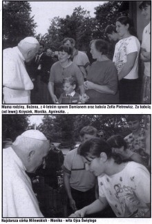 Bożena Milewska: Tak. Rok później byliśmy na audiencji generalnej w Watykanie. Pojechaliśmy tam dzięki życzliwości ludzi, a zwłaszcza księdza Ambrożego Andrzejaka z Kostrzyna nad Odrą. Ksiądz, w lipcu 200 roku z siostrą i szwagrem, podróżując szlakiem papieskim zawitał do nas.