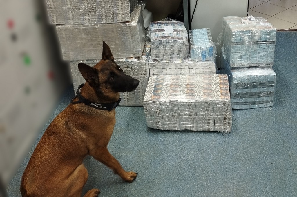 Mundurowi przeszukali również dwie posesje w pow. sokólskim i augustowskim, w których 35-latek mógÅ‚ przechowywać kontrabandÄ™. Tam zabezpieczono kolejne niemal 2500 paczek papierosów z biaÅ‚oruskim znakami akcyzy. Funkcjonariuszy w przeszukaniach pomieszczeÅ„ wspomagaÅ‚a Hiena, owczarek belgijski podlaskiej KAS wyszkolony do wykrywania wyrobów tytoniowych i waluty.