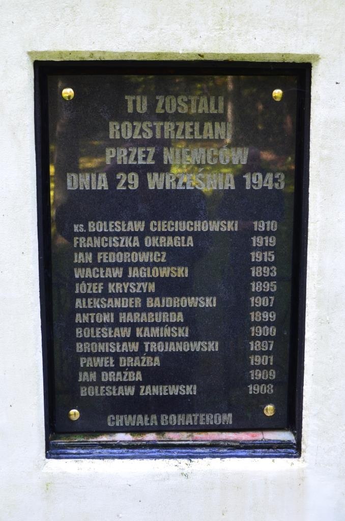 Pierwszy, drewniany krzyż w miejscu rozstrzelania Polaków, postawili okoliczni mieszkańcy tuż po wojnie. W 1957 roku Aleksander Butkiewicz, przedwojenny oficer Wojska Polskiego i więzień niemieckich obozów, zbudował pomnik i metalowy krzyż.
