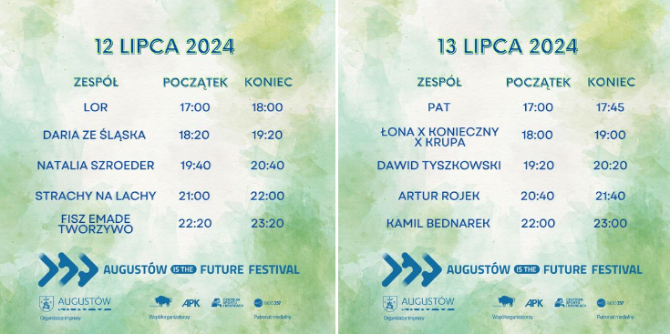 Koncerty w Augustowie rozpoczynać się będą o 17:00. Pierwszego dnia kolejno wystąpią Lor, Daria ze Śląska, Natalia Szroeder, Strachy na Lchy oraz Fisz Emde Tworzywo, a drugiego – Pat, Łona Konieczny Krupa, Daniel Tyszkowski, Artur Rojek i Kamil Bednarek.