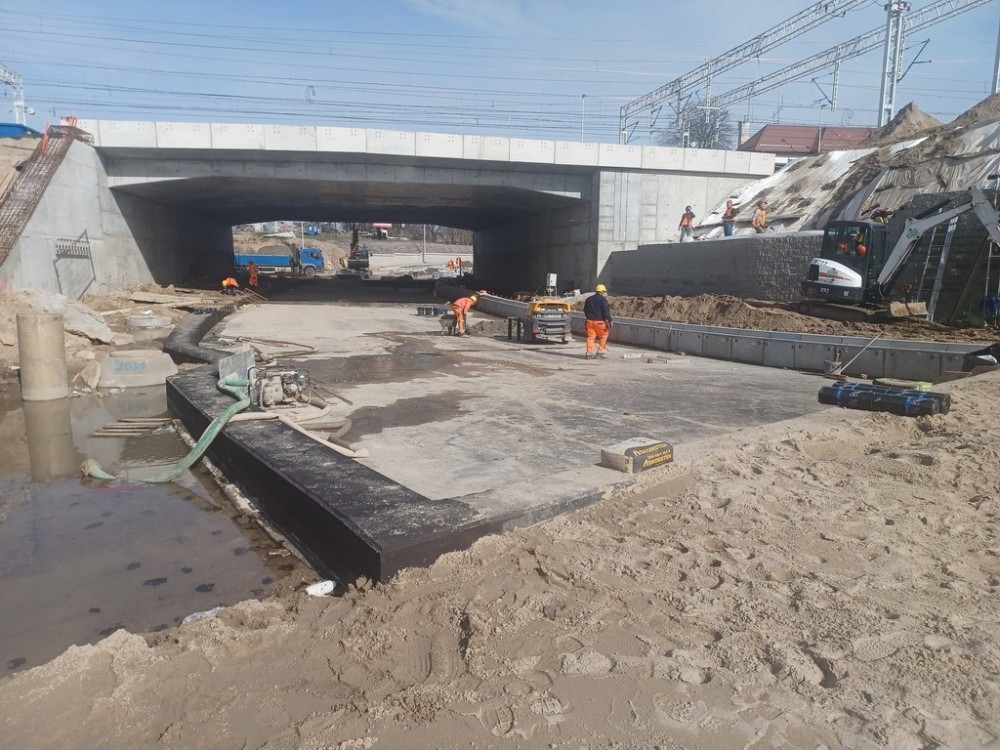 Pod wiaduktem kolejowym nad ul. Suwalską w Ełku zakończyło się betonowanie specjalnej konstrukcji – tzw. wanny szczelnej, która na przyszłość zabezpieczy ulicę przed zalaniem. Budowa dodatkowego zabezpieczenia w tym miejscu była niezbędna ze względu na trudne warunki wodno-gruntowe. Teraz wykonawca będzie mógł przystąpić do robót przy wykonywaniu warstw nawierzchni drogowej. Przebudowana ul. Suwalska będzie mieć po jednym pasie ruchu w każdym kierunku oraz dodatkowy lewoskręt w ul. Słoneczną, chodnik i ciąg pieszo rowerowy. Otwarcie skrzyżowania dla ruchu planowane jest na przełom maja i czerwca.