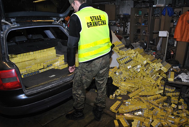 W niedzielÄ™ wieczorem funkcjonariusze z Placówki Straży Granicznej w Rutce – Tartak w ramach prowadzonych czynnoÅ›ci w jednym z suwalskich garaży ujawnili papierosy marki Jin Ling z rosyjskÄ… akcyzÄ…. W samochodzie marki audi znajdowaÅ‚o siÄ™ 12 tys. paczek papierosów. Szacunkowa wartość ujawnionej kontrabandy wynosi ponad 154 tys. zÅ‚otych. Uszczuplenia celno-podatkowe od tej kwoty wynoszÄ… ponad 256 tys. zÅ‚otych.