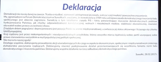 Pod Deklaracją Suwalska podpisały się posłanka Bożena Kamińska i wicemarszałek województwa Anna Naszkiewicz z Platformy Obywatelskiej, przedstawiciele PSL i SLD. W spotkaniu uczestniczyli reprezentanci suwalskiego Bloku Samorządowego. Teraz ma dochodzić do rozmów w węższych gronach, a efektem Forum mają być porozumienia lub wspólne listy w przyszłorocznych wyborach do samorządów.