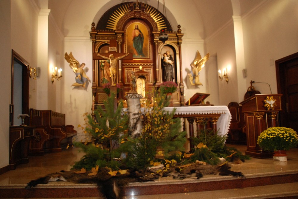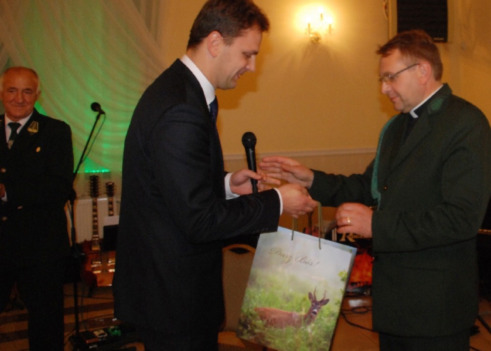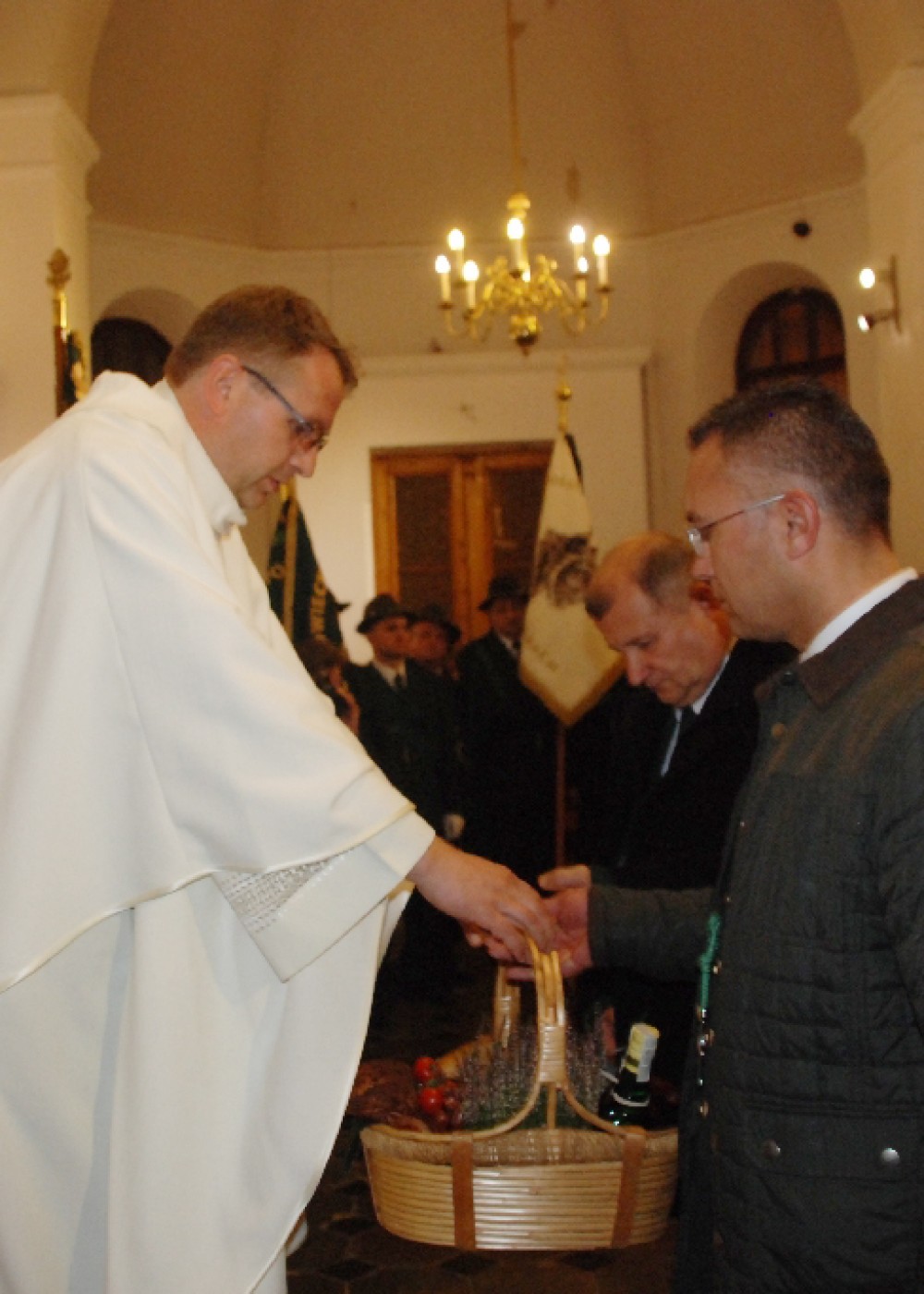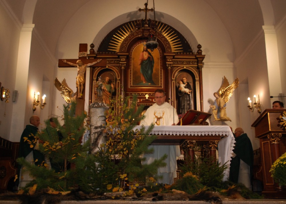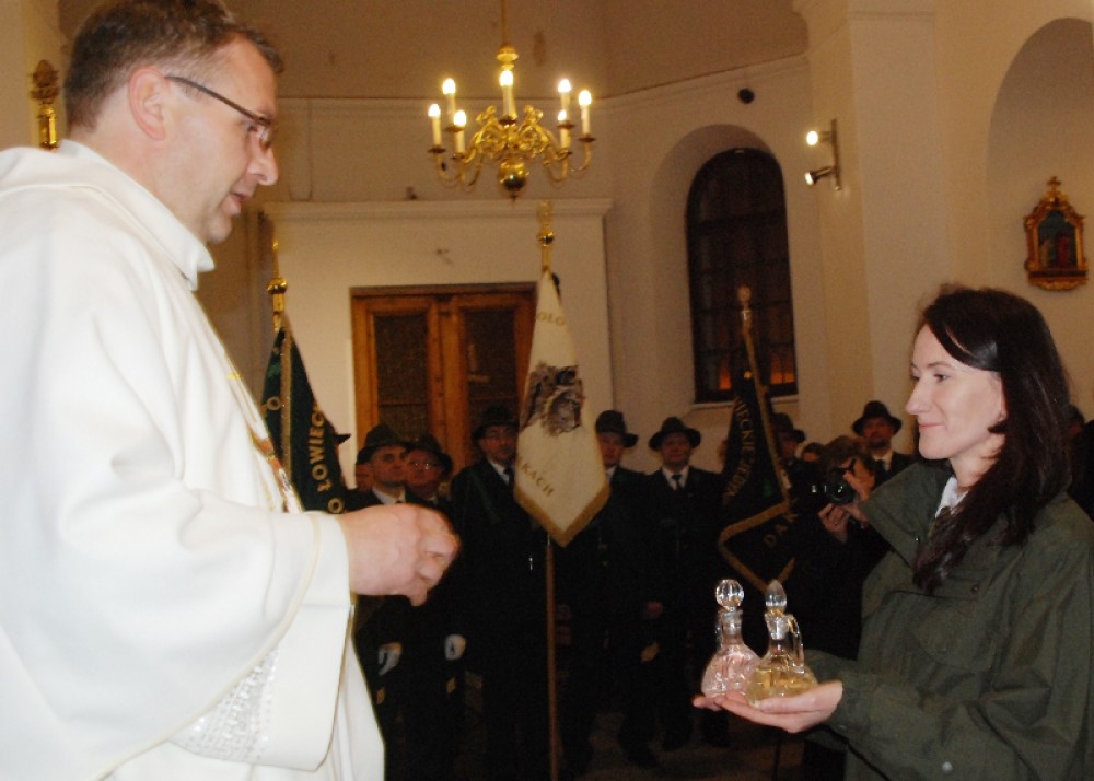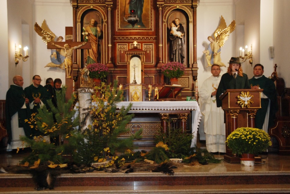 – Święty Hubert, ,patron myśliwych miał swoją historię. Musiał przejść bardzo długą drogę zanim odkrył głęboki sens i cel swojego życia, a jednocześnie to, co było jego pasją, potrafił na tyle uświęcić, że Kościół uznał go za godnego wyniesienia na ołtarze jako patrona myśliwych, leśników – w czasie homilii, zwracając się do myśliwych i ich rodzin mówił ks. prałat Jarema Sykulski. - Można powiedzieć, że wszyscy tu zgromadzeni, przez fakt chrztu, jesteśmy zobowiązani do troski o przyrodę, o świat. Słowa wypowiedziane przy stworzeniu do pierwszych rodziców: „bądźcie płodni, czyńcie ziemię sobie poddaną” nakazują każdemu następnemu pokoleniu pochylić się nad tym szczególnym darem bożym jakim jest przyroda, dzięki której możemy funkcjonować, możemy żyć. Często o myśliwych mówi się, że oni tylko strzelają, zabijają, wyrządzają szkody, krzywdy, zadają cierpienie... Nic bardziej błędnego, bo przecież podstawowym zadaniem myśliwego jest troska o przyrodę, o powierzoną sobie tę rzeczywistość, którą nazywamy łowiectwem, żeby móc pozyskiwać zwierzynę, trzeba o nią dbać. Pan Bóg mówiąc ”czyńcie ziemię sobie poddaną” dał przyzwolenie na korzystanie z tych dóbr, ale nie powiedział wykorzystujcie, niszczcie. Dlatego chcemy dziś prosić świętego Huberta, by w tym trudnym czasie, w świecie bardzo często pozbawionym wartości, nie zatracić tego, co jest najpiękniejsze. Każdy myśliwy przed oddaniem strzału patrzy przez lunetę i widzi krzyż. Ale to nie jest tylko ten znak, który ułatwia oddanie celnego strzału. To jest też ten znak, przez który powinniśmy patrzeć na świat, że ten krzyż zobowiązuje do odpowiedzi na pytanie, czy czyniąc sobie ziemię poddaną postępuję z wolą Boga.”
