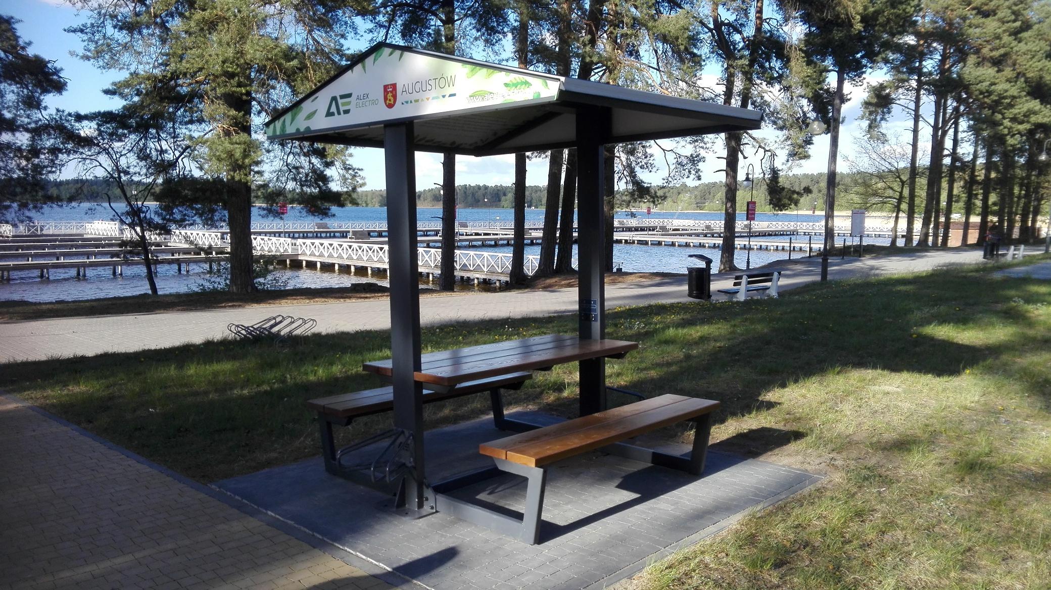 Wiata ustawiona na okres 5 miesięcy. Do Augustowa dostarczyła ją firma Elektro Alex z Podlasia.