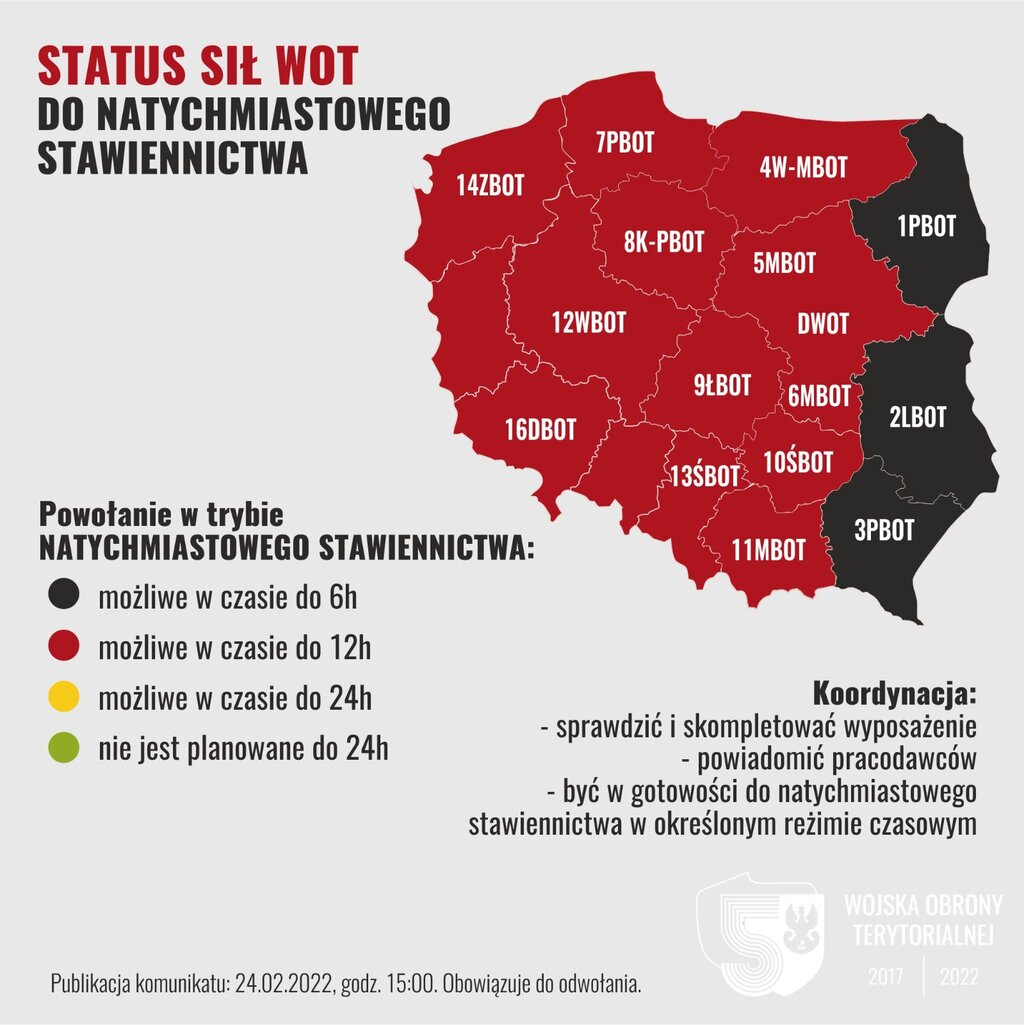 Wszyscy żoÅ‚nierze Wojsk Obrony Terytorialnej sÄ… zobowiÄ…zani do sprawdzenia wyposażenia, powiadomienia pracodawców oraz zapewnienia sobie możliwoÅ›ci stawiennictwa w zmienionym reżimie czasowym.