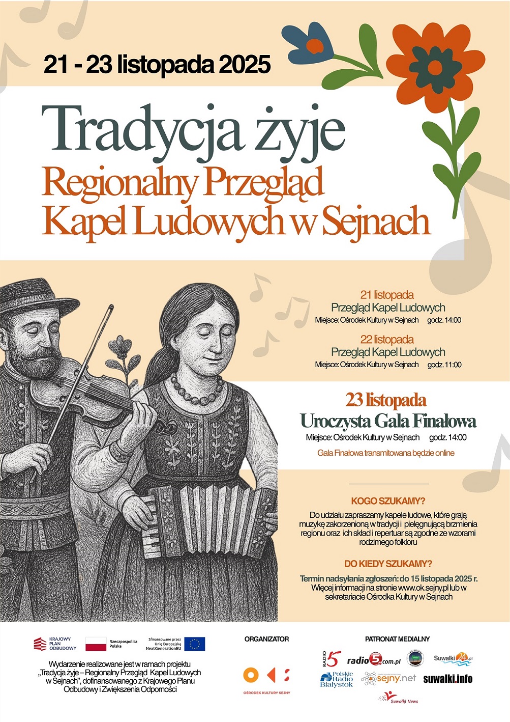 Wydarzenie realizowane jest w ramach projektu „Tradycja żyje – Regionalny Przegląd Kapel Ludowych w Sejnach”, dofinansowanego z Krajowego Planu Odbudowy i Zwiększenia Odporności, Komponent: Odporność i konkurencyjność gospodarki, Inwestycja A2.5.1 Program wspierania działalności podmiotów sektora kultury i przemysłów kreatywnych na rzecz stymulowania ich rozwoju.