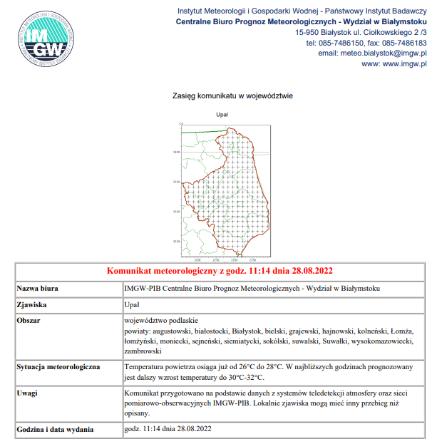 Temperatura powietrza osiąga już od 26°C do 28°C. W najbliższych godzinach prognozowany jest dalszy wzrost temperatury do 30°C-32°C – informuje białostockie biuro prognoz IMGW-PiB w ostrzeżeniu wydanym w niedzielę, 28 sierpnia o godz. 11:14.