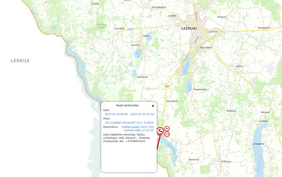 Zgodnie z umową podpisaną na początku lutego 2024 r. przez litewską Dyrekcję Dróg Via Lietuva, na odcinku od Lazdijai-Akmeniai do granicy z Polską zostaną przeprowadzone główne remonty dróg. Wartość umowy o wykonanie robót wynosi 708 tys. euro, prace wykona spółka UAB Parama, która wygrała przetarg publiczny.