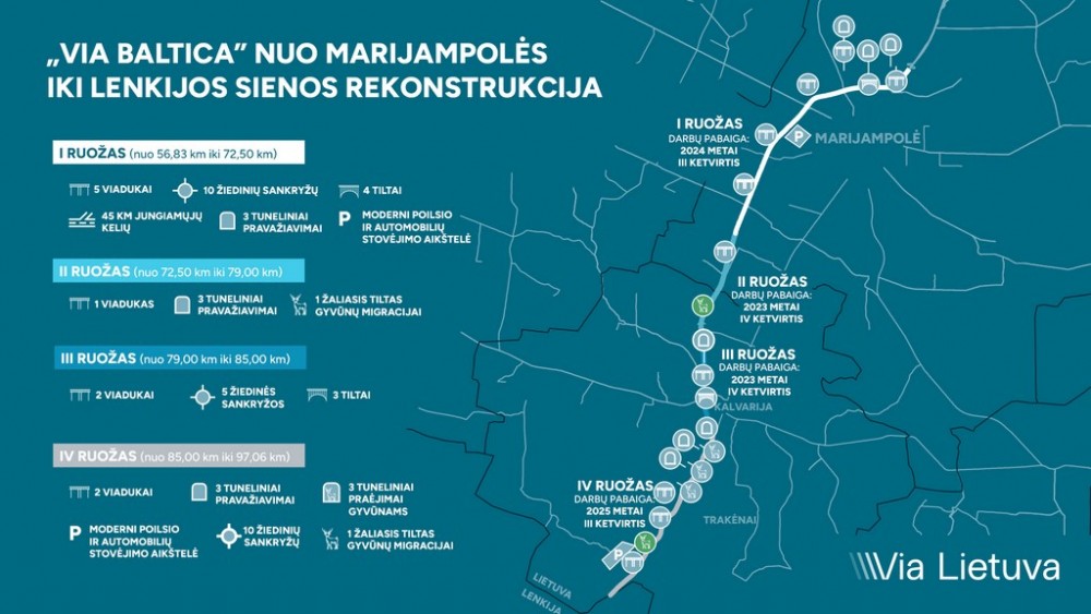 W ramach realizacji projektu na tym odcinku powstaną 2 wiadukty, 3 przejścia tunelowe dla zwierząt, 10 rond, 3 przejścia tunelowe, 1 parking i miejsce odpoczynku (najnowocześniejsze jak dotąd na Litwie) oraz 1 zielony most dla migracji zwierząt.