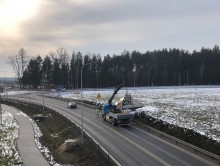Obecnie trwa m.in. montaż ogrodzeń i oznakowania pionowego na budowie drogi. Zakończone zostało już układanie nawierzchni betonowej, pozostały roboty wykończeniowe.