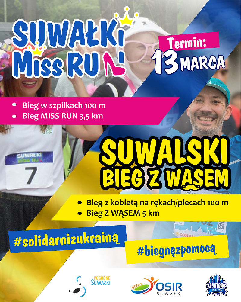 Zaplanowane na najbliższą niedziele, 13 marca o godz.13:00 nad zalewem Arkadia biegi Suwałki Miss Run oraz Suwalski Bieg z Wąsem będą miały charakter charytatywny - zapowiadają organizatorzy z Ośrodka Sportu i Rekreacji oraz Stowarzyszenia Sportowe Miasto.