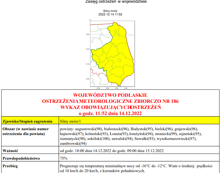 Białostocki wydział Centralnego Biura Prognoz Meteorologicznych IMGW-PIB wydał ostrzeżenie o silnych mrozach, obowiązujące od dzisiejszego wieczora do godz. 9:00 w czwartek.