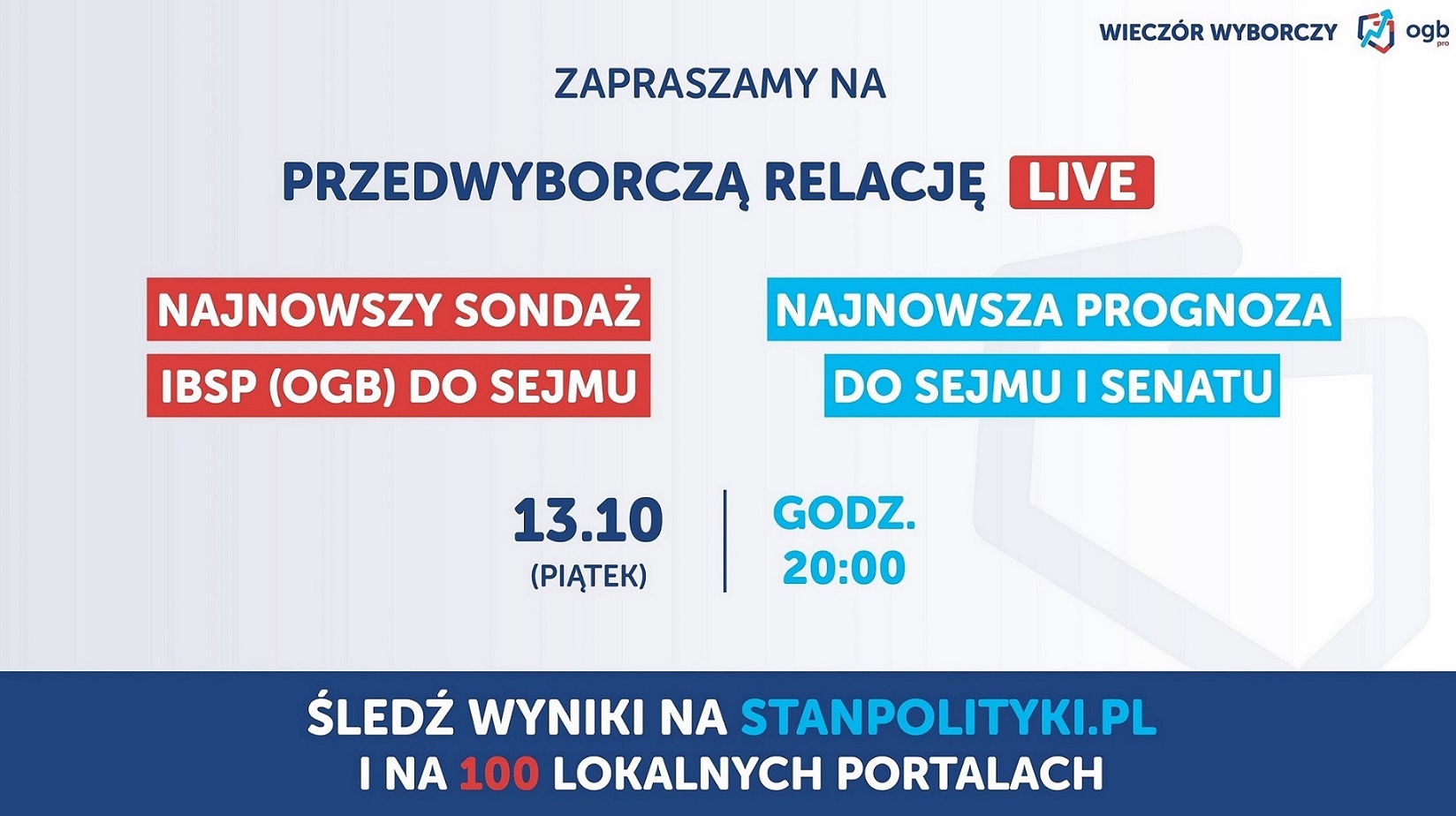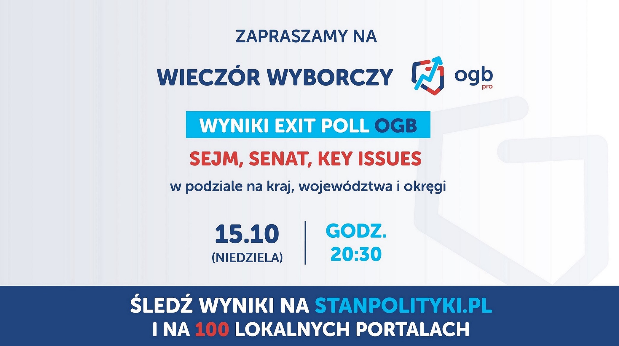 Wieczór wyborczy OGB Pro, który rozpocznie się o 20:30 w niedziele, będzie można śledzić na żywo w mediach społecznościowych (YouTube, Facebook, TikTok oraz Twitch), a wszystkie dane będą dostępne na stronie StanPolityki.pl. Relacja z wieczoru wyborczego będzie oparta o pierwsze w Polsce narzędzie typu “Magic Wall” do prezentowania wyników wyborów. Do pobrania będzie także specjalna aplikacja “OGB Pro - Story Wall” dostępna na urządzenia mobilne z systemem iOS oraz Android.
