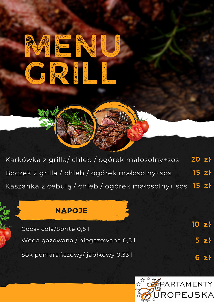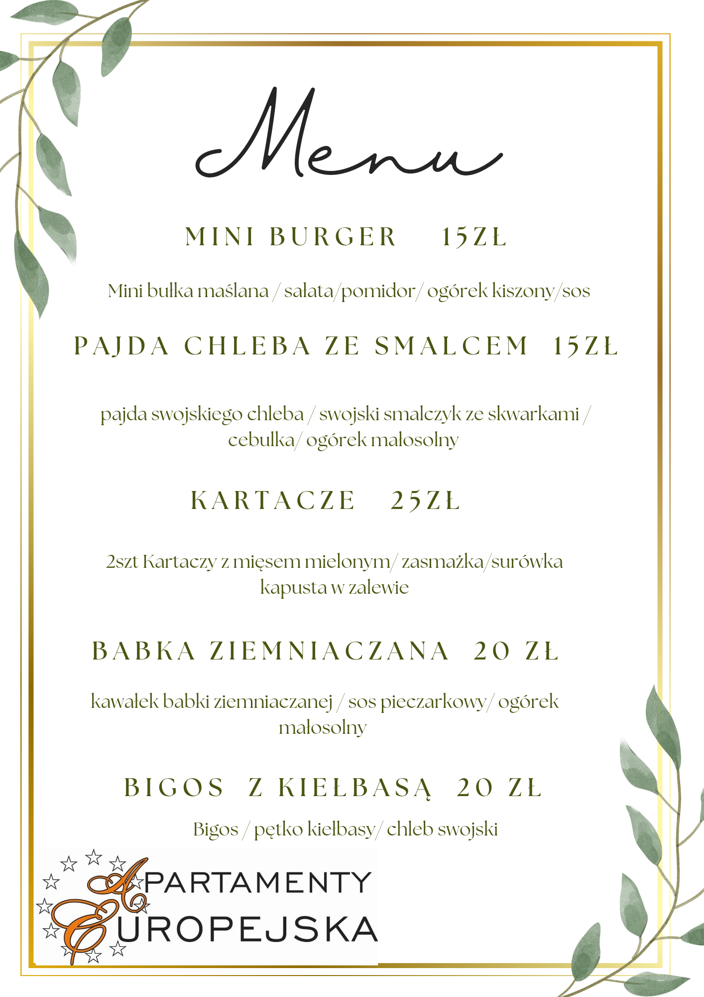 Apartamenty Europejska przygotowaÅ‚a do sprzedaży w strefie gastronomicznej tradycyjne dania. BÄ™dÄ… kartacze, babka ziemniaczana z sosem pieczarkowym, bigos z kieÅ‚basÄ… , mini burgery , pajda chleba ze smalcem , ogórek maÅ‚osolny , dania z grilla: kaszanka, boczek , karkówka , napoje i trunki.