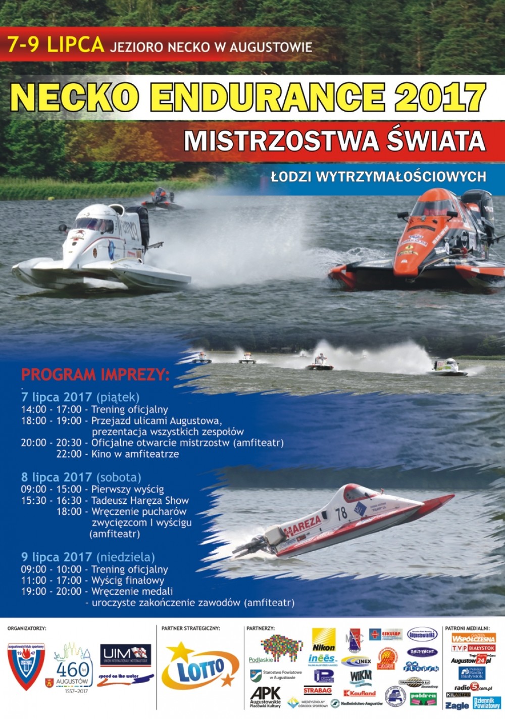 Oficjalne otwarcie Mistrzostw Necko Endurance odbędzie się w piątek, 7 lipca o godz. 20:00 w amfiteatrze. Wcześniej, około godz. 18:00 wszystkie zespoły przejadą ulicami Augustowa. W sobotę, 8 lipca zawody trwać będą od godz. 9:00 do 15:00, po zawodach o godz. 15:30-16:30 zaplanowano show Tadeusza Haręzy, a w niedzielę wyścig finałowy odbywać się będzie w godz. 11:00 – 17:00. Każdego dnia, po zawodach, w amfiteatrze prowadzone będą ceremonie medalowe. Serdecznie zapraszamy!
