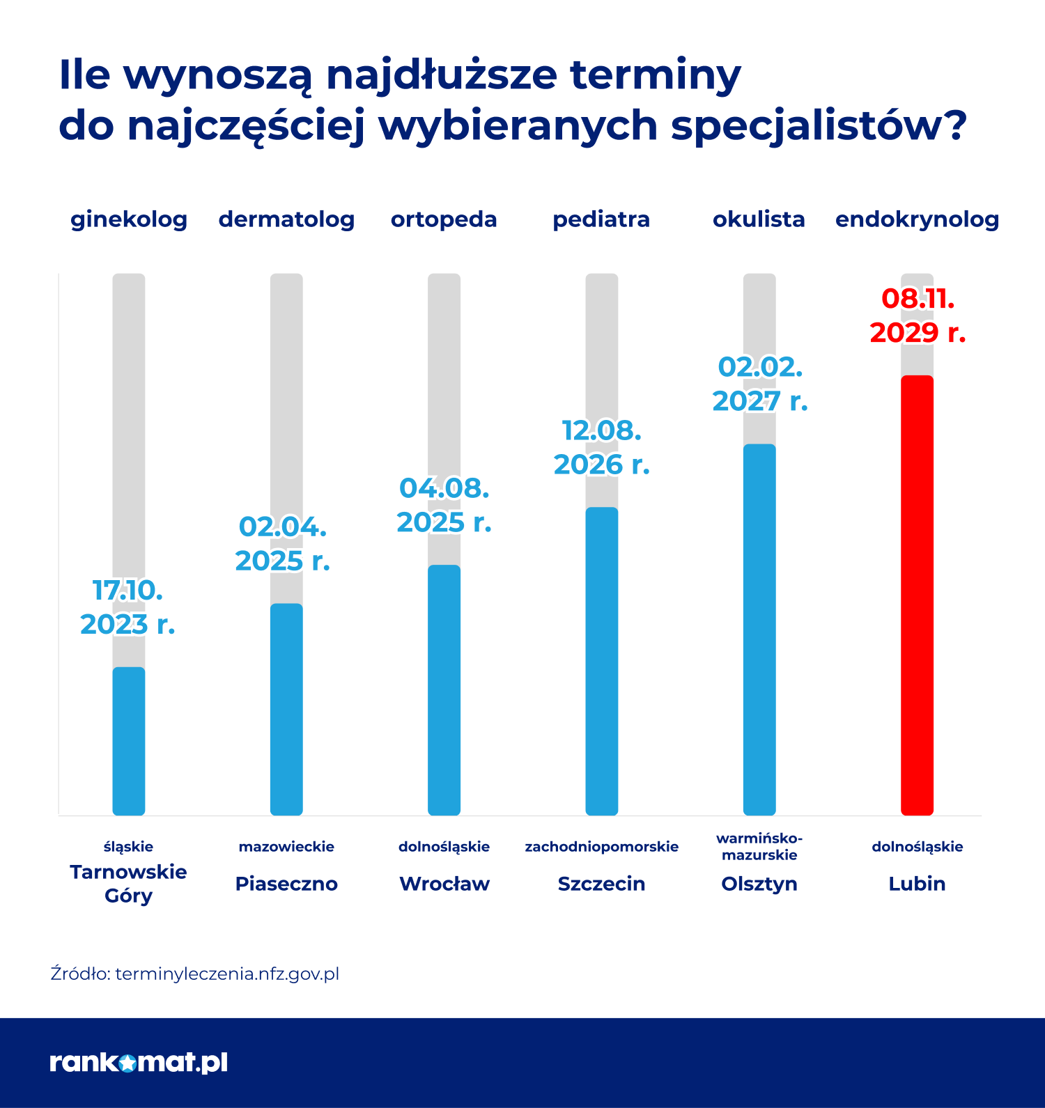 Maksymalny czas oczekiwania na spotkanie z pediatrą w Szczecinie wynosi prawie 4 lata (12.08.2026 r.), na okulistę w Olsztynie (warmińsko-mazurskie) możemy poczekać do 5 lat (02.02.2027 r.). Rekord dotyczy endokrynologa, na którego w Lubinie (dolnośląskie) najdłuższy termin przypada na 2029 rok (a dokładnie 08.11.2029 r.). Wizyty w przeciągu kilku dni lub tygodni oczywiście są możliwe, jednak są one zależne od tego, jakimi zasobami dysponują poszczególne przychodnie.
