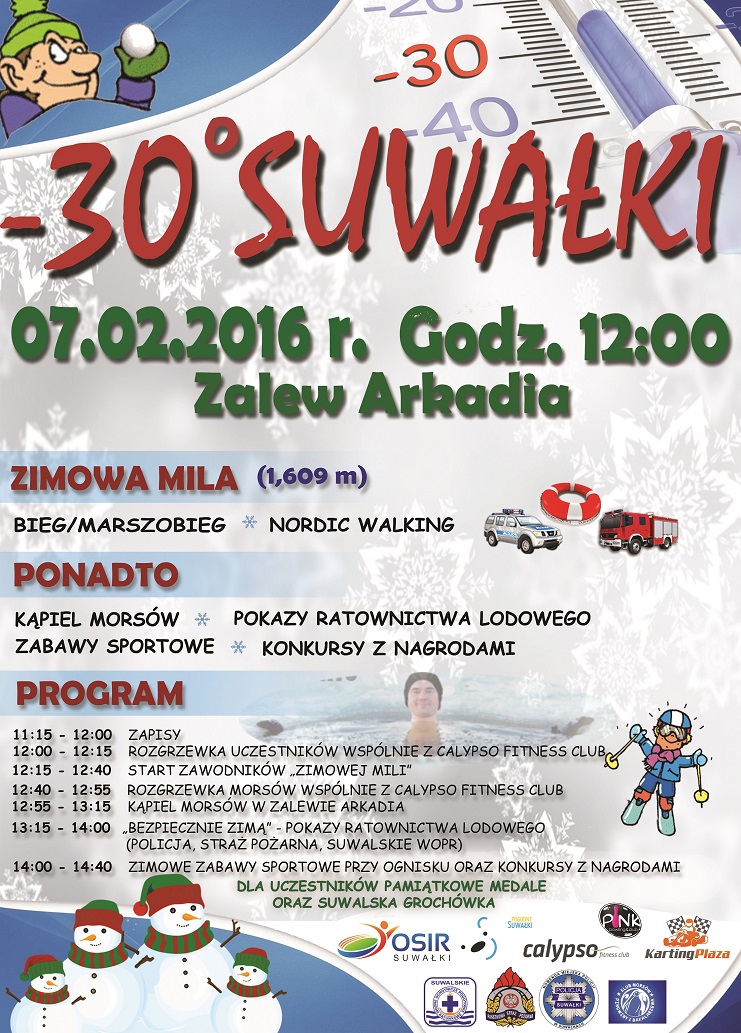 W programie kilkugodzinnej imprezy dla ludzi aktywnych i ciekawych wrażeÅ„ pozostaÅ‚y za to „Bieg na milÄ™” oraz Spacer z kijkami do nordic walking. Ciekawie zapowiadajÄ… siÄ™ pokazy ratownictwa sÅ‚użb mundurowych oraz zawsze efektowna kÄ…piel „Morsów”. Nie zabraknie również suwalskiej grochówki. Uczestnicy biegów otrzymajÄ… pamiÄ…tkowe medale, a najlepsi puchary.