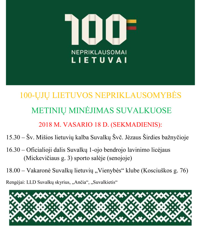 Setna rocznica odzyskania przez Litwę niepodległości przypada 16 lutego, a suwalscy Litwini organizują uroczystości dwa dni później, w niedzielę.