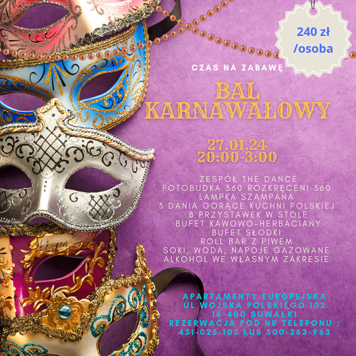 Za tydzień, w ostatnią sobotę stycznia o godz. 20:00 w Apartamentach Europejska przy ul. Wojska Polskiego rozpocznie się Bal Karnawałowy. Do tańca zaprosi uczestników zespół muzyczny „The Dance”.