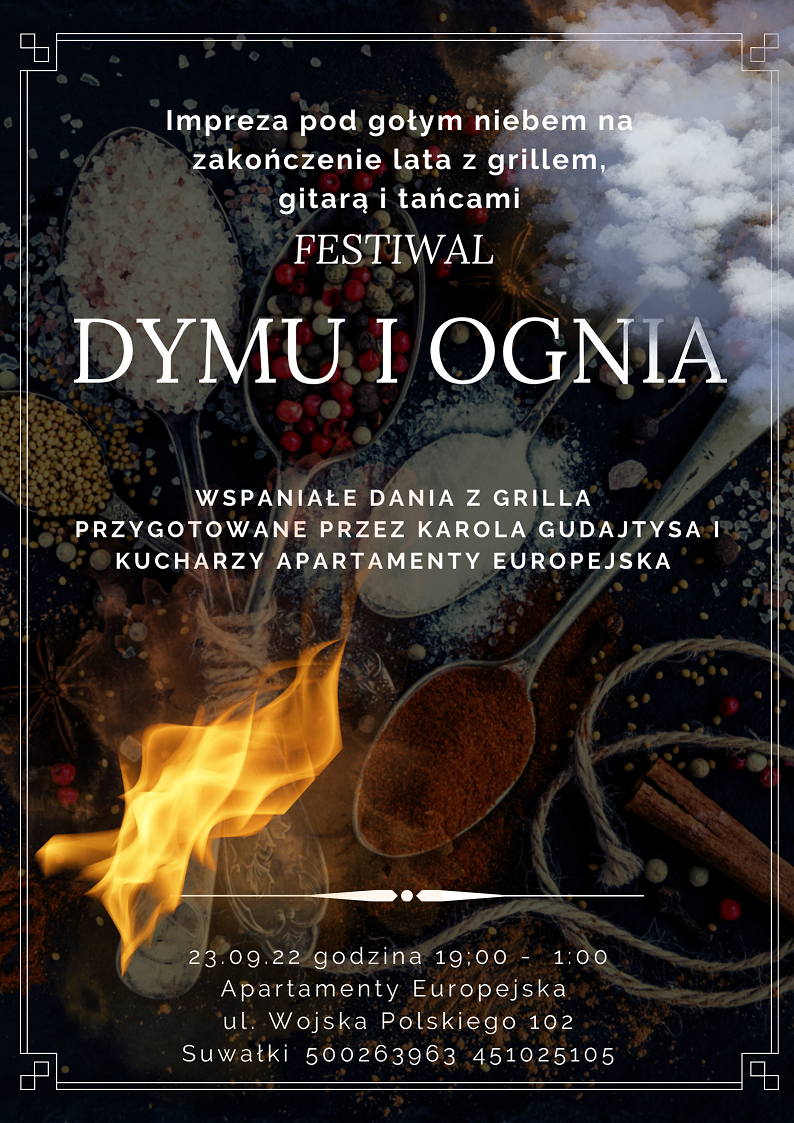 Prognozy są obiecujące, pogoda ma sprzyjać imprezom pod gołym niebem, a taką będzie planowany na 23 września (piątek), Festiwal Dymu i Ognia. Na zakończenie lata z gitarą, tańcami i grillem przepyszne dania przygotują Karol Gudajtys i kucharze restauracji Apartamenty Europejska.