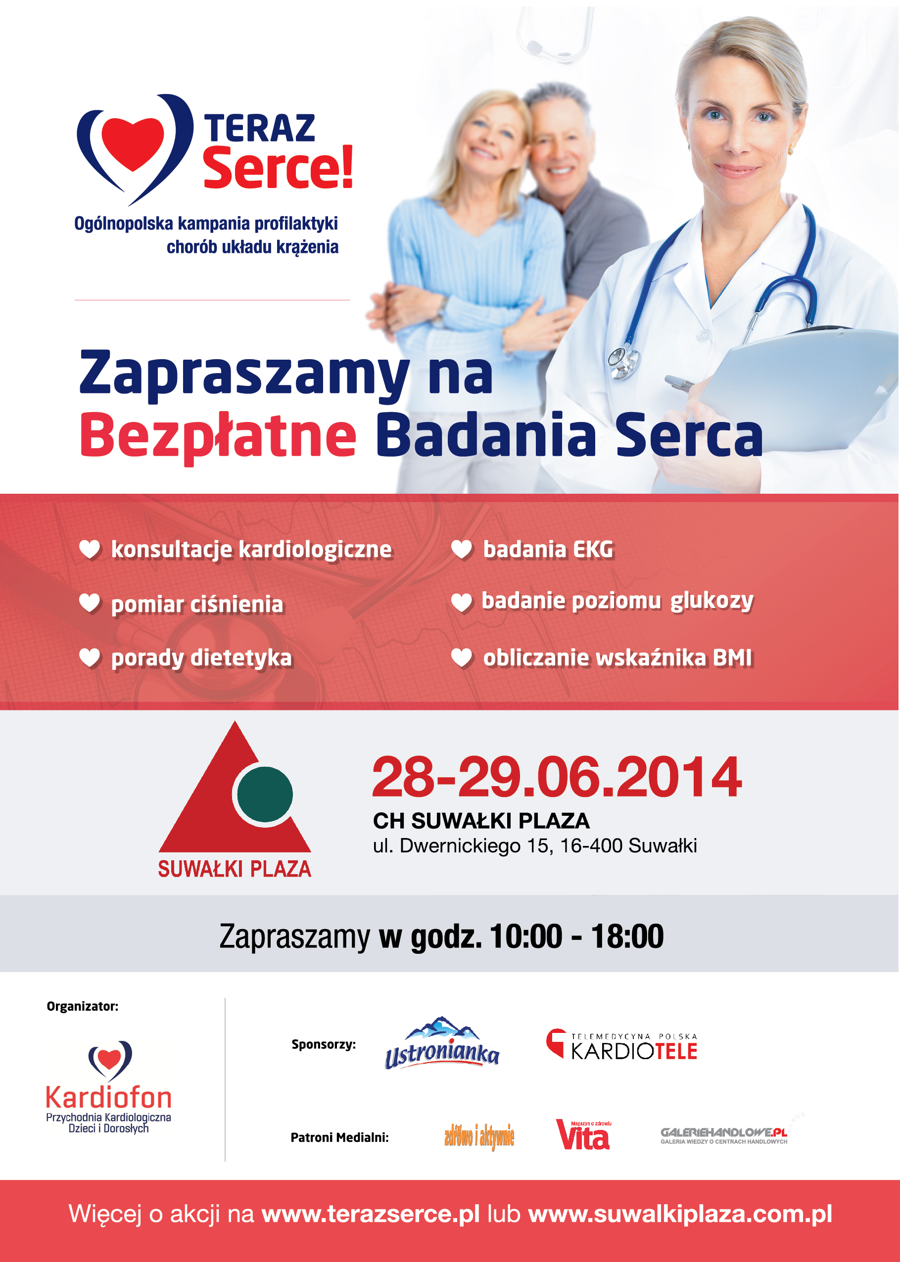 W najbliższą sobotę i niedzielę, 28-29 czerwca, w Centrum Handlowym Suwałki Plaza odbędzie się akcja bezpłatnych badań serca w ramach ogólnopolskiej kampanii profilaktyki chorób układu krążenia „Teraz Serce!”
