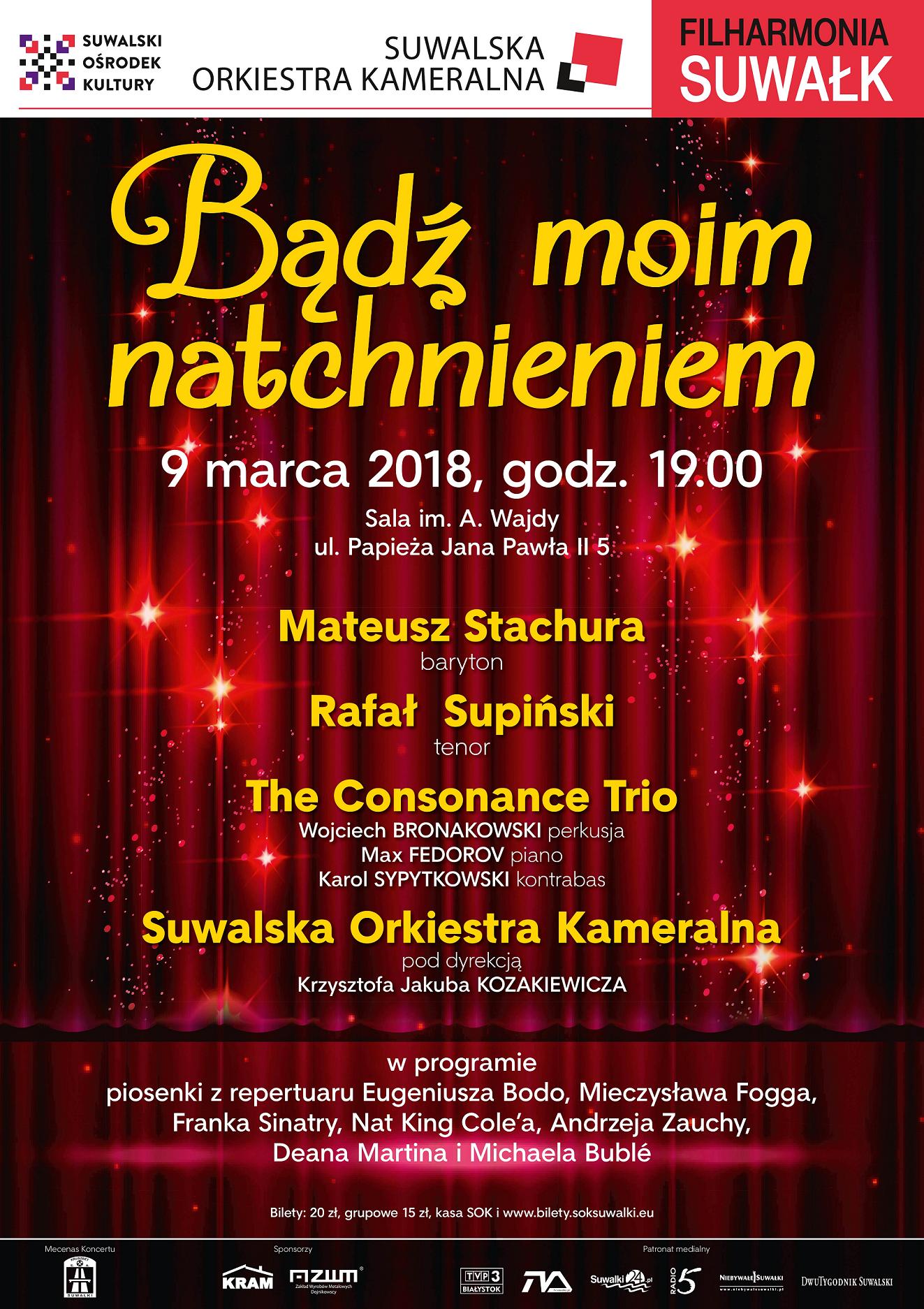 Suwalski Ośrodek Kultury zaprasza i gorąco poleca koncert Suwalskiej Orkiestry Kameralnej dedykowany wszystkim Paniom z okazji Dnia Kobiet. Instrumentalistom orkiestry towarzyszyć będą znamienici goście - zespół The Consonance Trio oraz dwaj utalentowani, młodzi soliści Rafał Supiński (tenor) i Mateusz Stachurski (baryton). Koncert zatytułowany BĄDŹ MOIM NATCHNIENIEM odbędzie się 9 marca o godzinie 19.00 w Sali im. A. Wajdy. Bilety w atrakcyjnych cenach 20 zł normalny oraz 15 zł grupowy (powyżej 10 osób) już w sprzedaży!