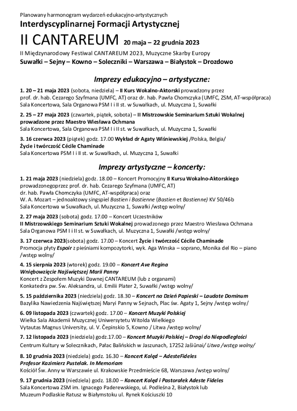 - WracajÄ…c do tradycji prezentowania adaptacji dzieÅ‚ operowych, tÄ™ edycjÄ™ festiwalu rozpoczniemy w dniu 21.05.2023 (niedziela) o godz.18.00 spektaklem Bastien i Bastienne W. A. Mozarta, który odbÄ™dzie siÄ™ Sali Koncertowej PSM I i II st, ul. Muzyczna 1 (szczegóÅ‚owe informacje w załącznikach). Natomiast w dniu 27.05.2023 (sobota) o godz. 17.00 w Sali Organowej PSM I i II st. w SuwaÅ‚kach, ul. Muzyczna 1, odbÄ™dzie siÄ™ Koncert Uczestników II Mistrzowskiego Seminarium Sztuki Wokalnej, które ponownie bÄ™dzie prowadziÅ‚ Maestro WiesÅ‚aw Ochman – informuje Marlena Borowska.