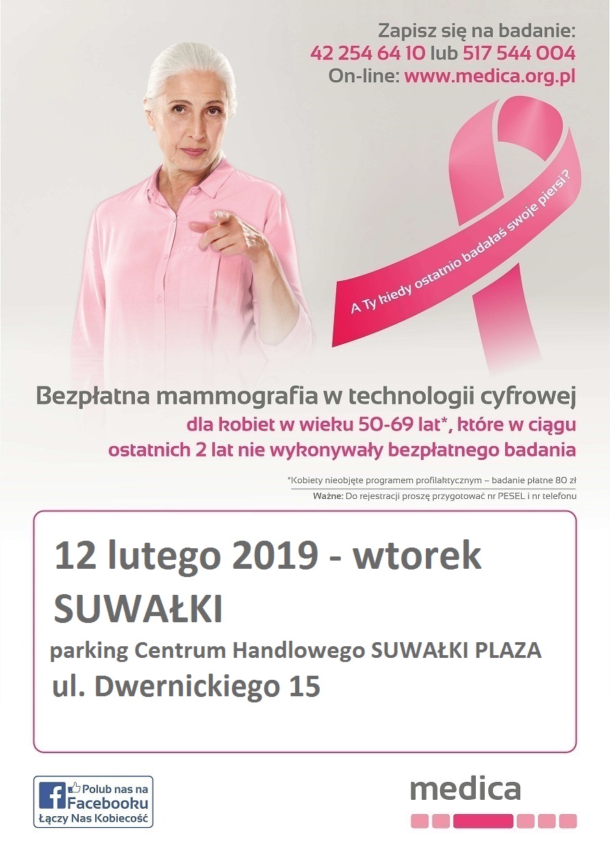Zapraszamy wszystkie mieszkanki Suwałk w wieku 50-69 lat, które w ciągu ostatnich 24 miesięcy nie wykonywały mammografii na bezpłatne badanie mammograficzne w ramach NFZ.