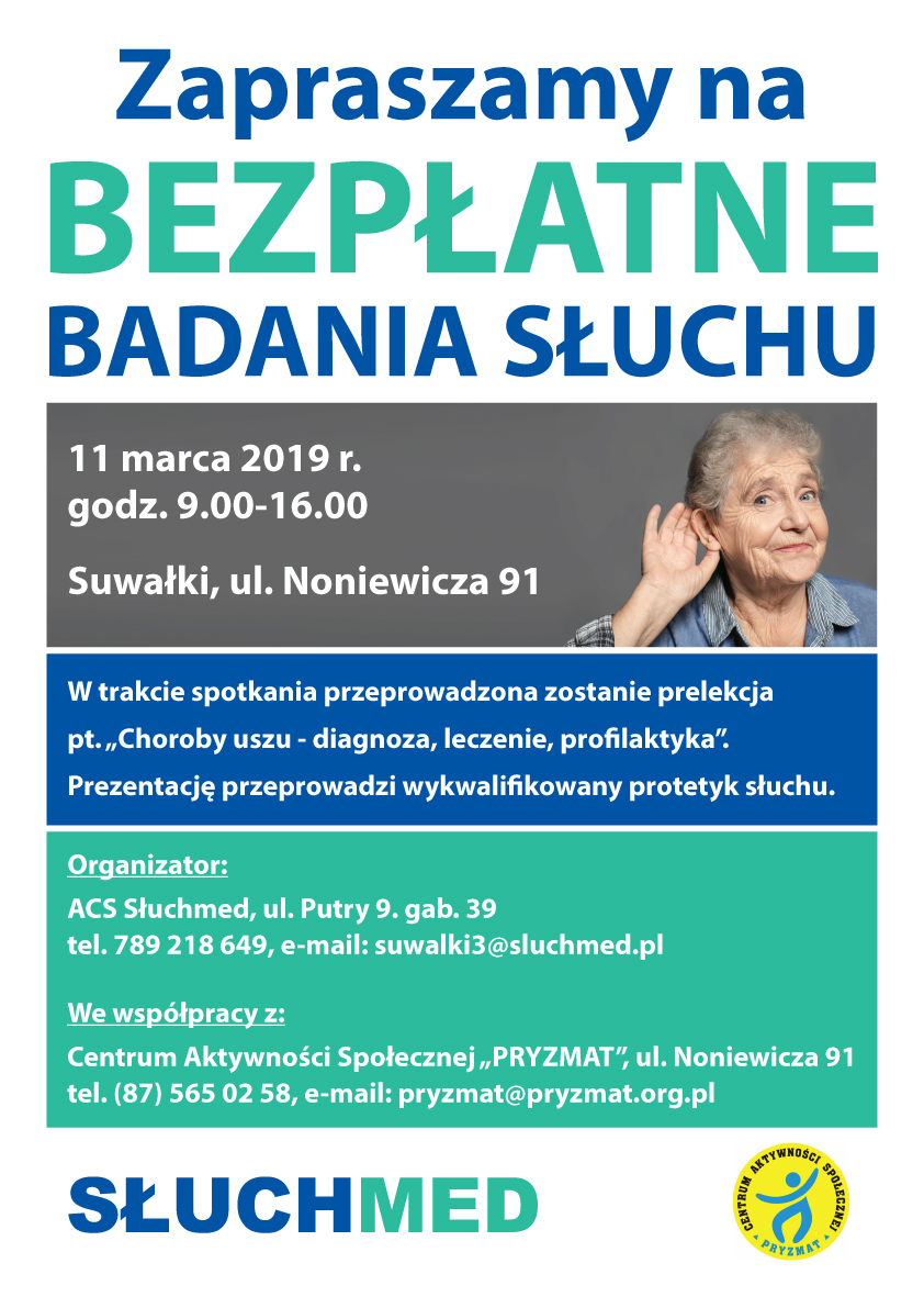 ACS SŁUCHMED we współpracy z Centrum Aktywności Społecznej PRYZMAT serdecznie zaprasza na bezpłatne badanie słuchu, które odbędzie się 11 marca 2019 w godz. 9.00-16.00 w sali konferencyjnej PRYZMAT-u, przy ul. Noniewicza 91 w Suwałkach.
