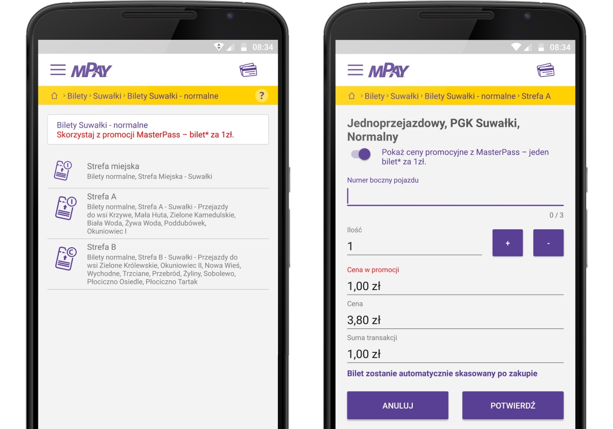 Kupowanie biletów za pomocą karty płatniczej jest bardzo proste. Wystarczy uruchomić mPay w komórce, a następnie wybrać Suwałki z listy miast i potrzebny bilet. Kolejny krok to wybór mPay Wallet jako formy płatności i zatwierdzenie operacji. Pasażerowie mogą też płacić za bilety środkami, którymi wcześniej zasilili swoją elektroniczną portmonetkę (np. zwykłym przelewam bankowym). Wszystkie zakupione bilety zostają automatycznie zapisane w aplikacji. Podczas kontroli wystarczy wejść do zakładki „Kontrola biletów”, wybrać aktywny bilet i okazać go kontrolerowi. Można to zrobić nawet wtedy, gdy telefon nie ma połączenia z Internetem.