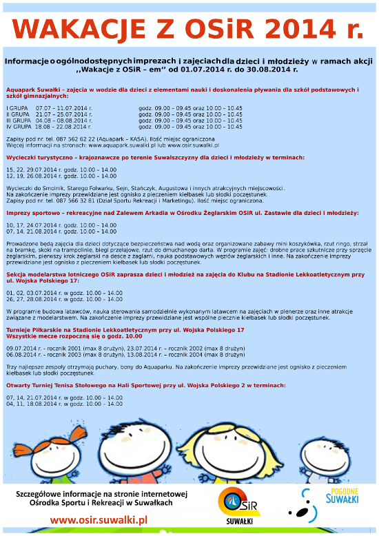 Ośrodek Sportu i Rekreacji w Suwałkach zaprasza w czasie brzydkiej pogody na zajęcia sekcji modelarskiej oraz do Aquaparku, przy ul. Jana Pawła II. A gdy aura się w końcu poprawi, w programie wycieczki rowerowe, imprezy sportowo-rekreacyjne oraz turnieje piłkarskie.