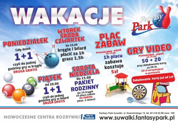 W Fantasy Park w Centrum Handlowo-Rozrywkowym Suwałki Plaza w okresie wakacyjnym będzie można skorzystać z promocji na plac zabaw, bilard, kręgle oraz gry wideo. Oczywiście, na nowości filmowe zaprasza również Cinema Lumiere w Suwałkach.