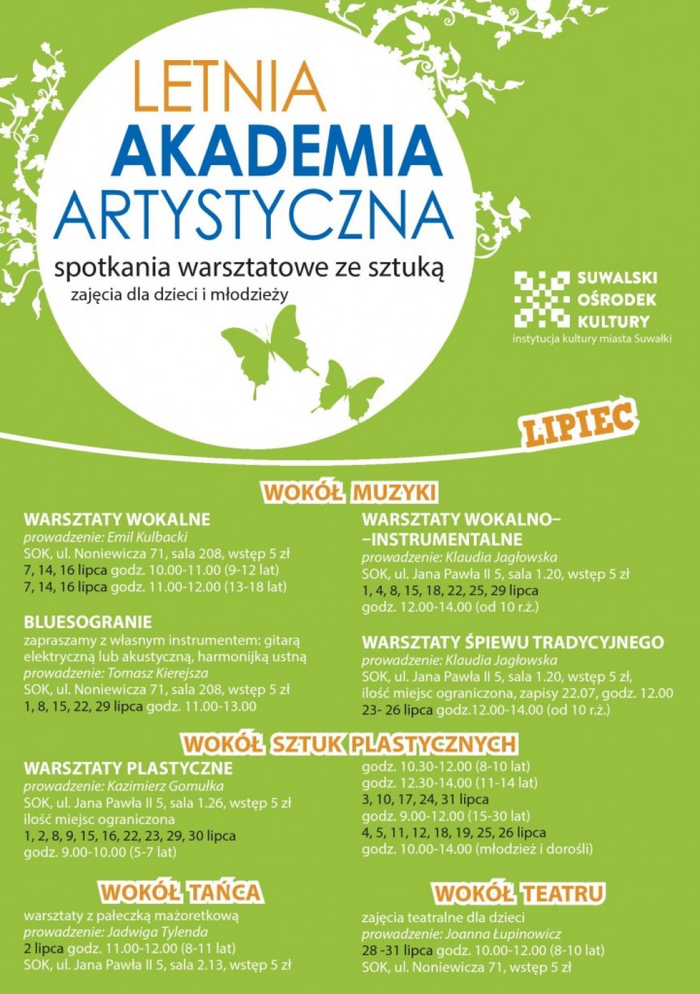 W Suwalskim Ośrodku Kultury już od wtorku, 1 lipca rusza Letnia Akademia Artystyczna. Dzieci i młodzież będą mogły twórczo spędzić wakacje na spotkaniach warsztatowych ze sztuką. W programie: zajęcia teatralne, taneczne, muzyczne oraz plastyczne.