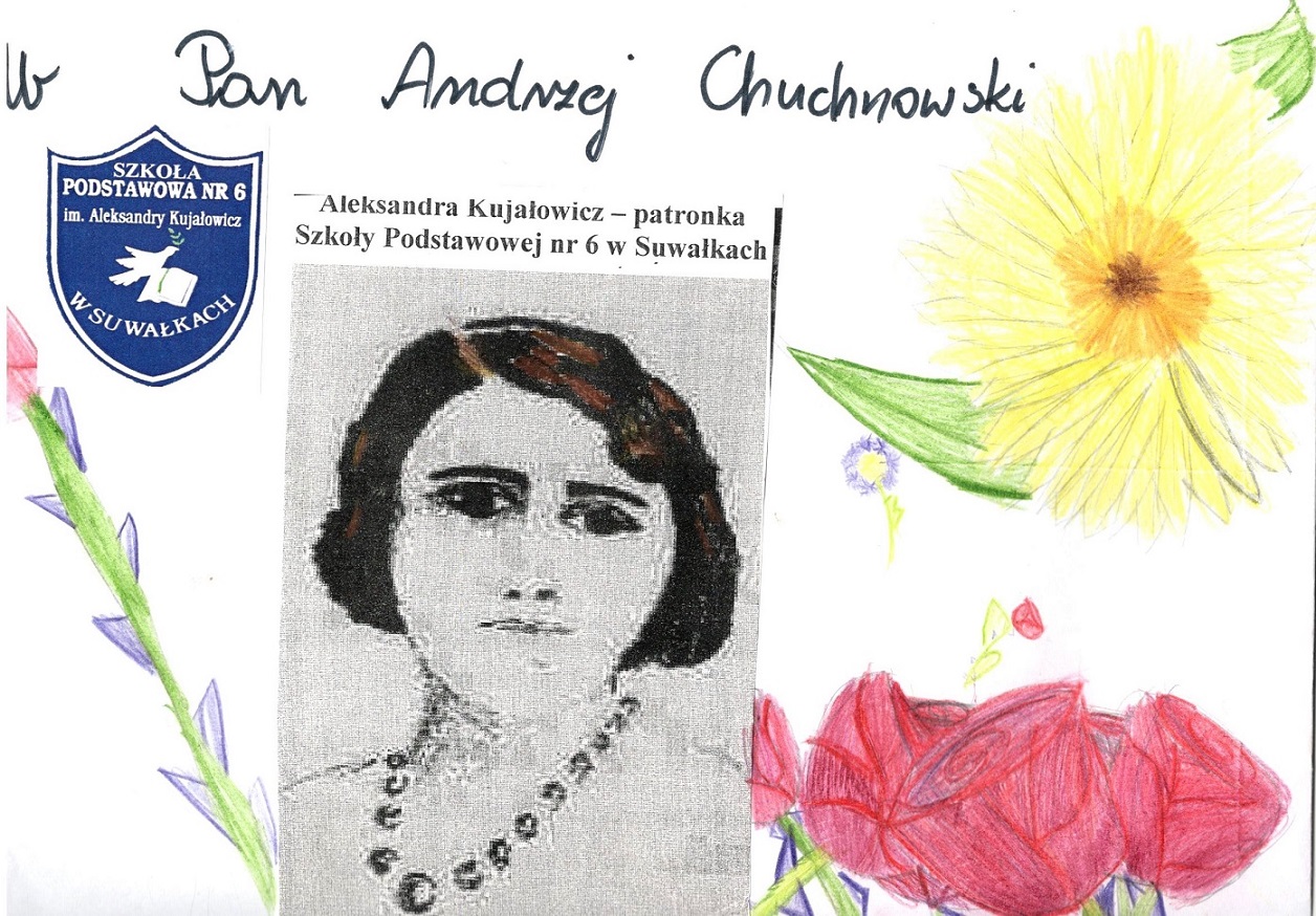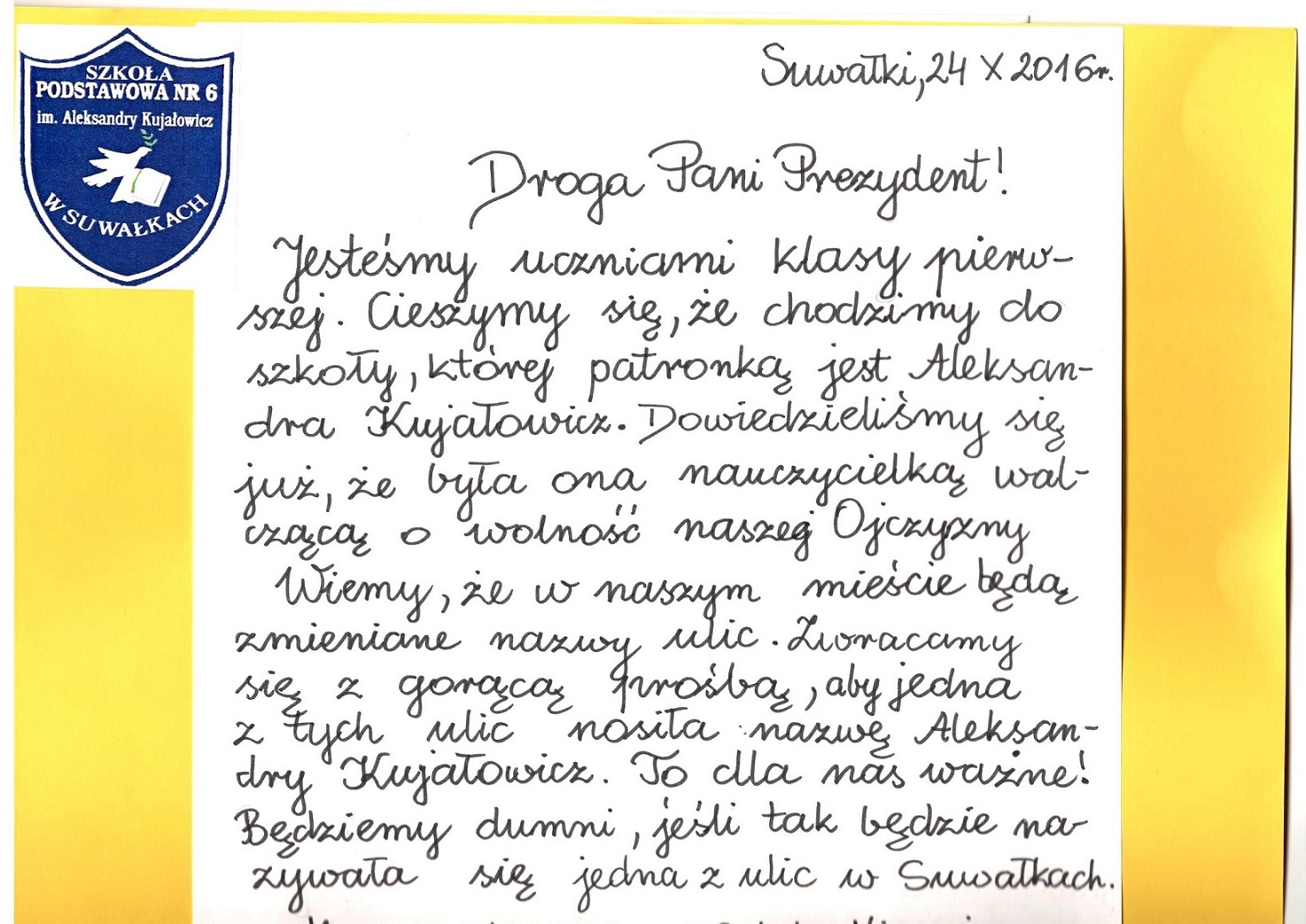 ChcielibyÅ›my, aby jedna z ulic w SuwaÅ‚kach nosiÅ‚a nazwÄ™ patronki naszej szkoÅ‚y Aleksandry KujaÅ‚owicz. (…) Uważamy, że jest to ważna postać w historii SuwaÅ‚k i jest warta zapamiÄ™tania. Wraz z wybuchem II Wojny Åšwiatowej Aleksandra KujaÅ‚owicz włączyÅ‚a siÄ™ aktywnie w dziaÅ‚alność konspiracyjnÄ…. UczestniczyÅ‚a w pierwszej grupie ruchu oporu na Suwalszczyźnie pod nazwÄ… Tymczasowej Rady Ziemi Suwalskiej. Wraz z innymi czÅ‚onkami organizacji zostaÅ‚a aresztowana i po dÅ‚ugim Å›ledztwie, i przesÅ‚uchaniu skazana na karÄ™ Å›mierci. „OleÅ„ka” zostaÅ‚a rozstrzelana przez hitlerowców 26 kwietnia 1940 roku ok. godziny 18 w lesie w pobliżu SuwaÅ‚k i pochowana w zbiorowej mogile. MiaÅ‚a zaledwie 30 lat.