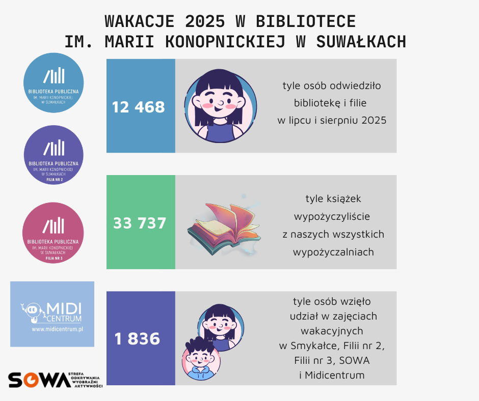 Lato w Bibliotece im. Marii Konopnickiej w Suwałkach upłynęło pod znakiem książek i kreatywnych zajęć. W lipcu i sierpniu 2025 roku bibliotekę główną oraz jej filie odwiedziło aż 12 468 osób.