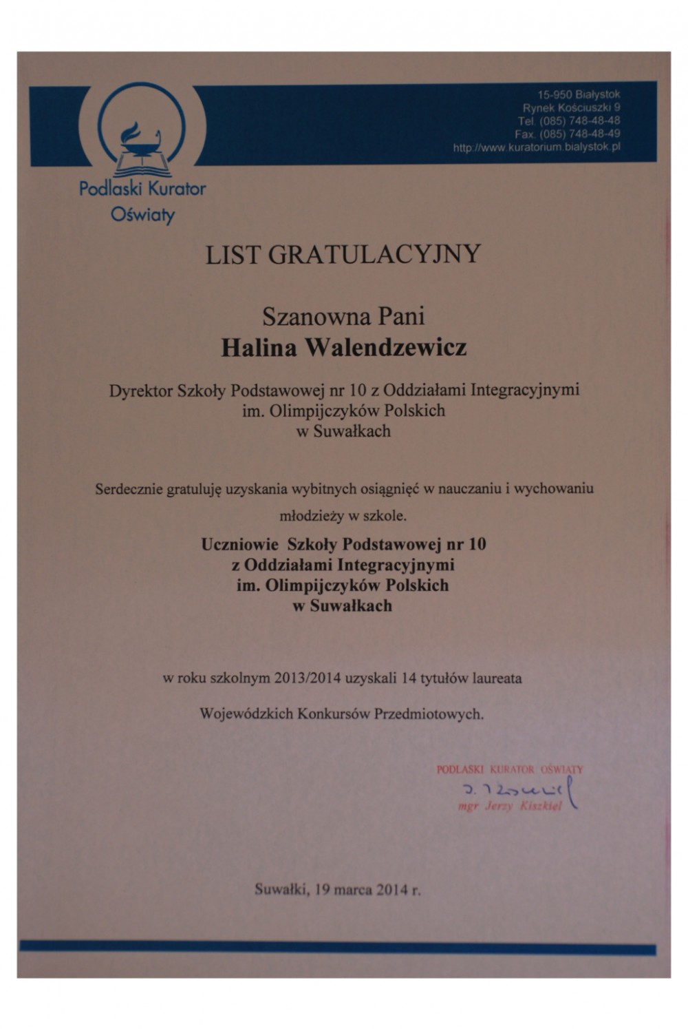 Inne suwalskie szkoły też mają się czym pochwalić. Oto lista laureatów konkursów przedmiotowych w roku szkolnym 2013/2014: