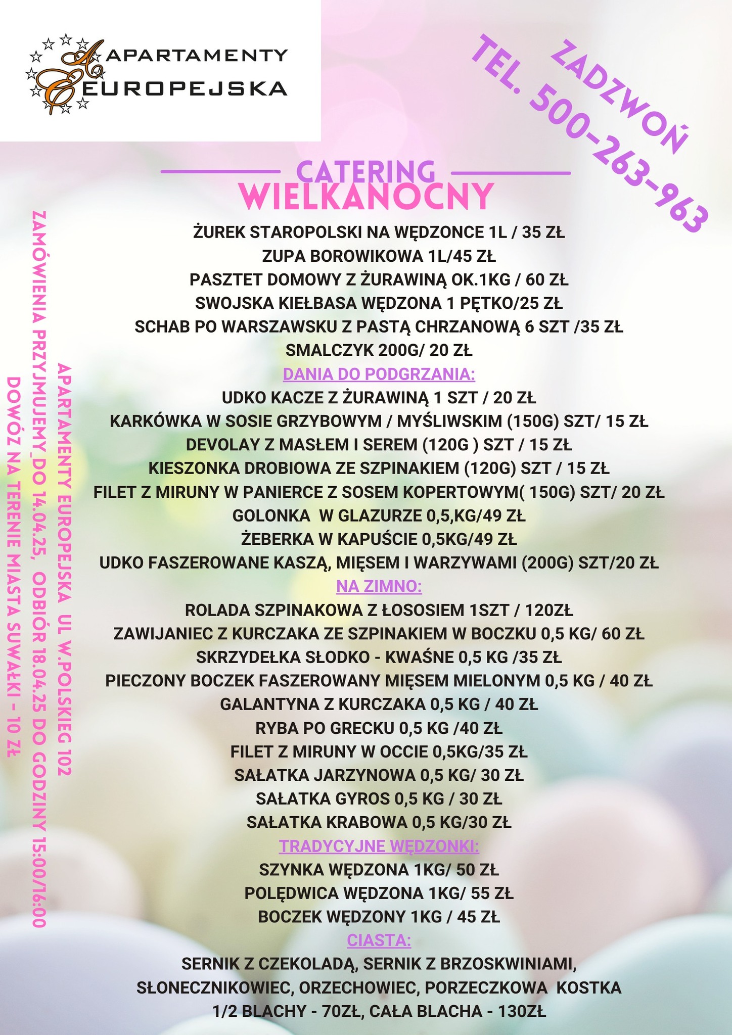 Catering Wielkanocny z odbiorem w Wielki Piątek, 18 kwietnia w Apartamentach Europejska przy ul. Wojska Polskiego 102 do godz. 15:00-16:00 lub z dowozem do domu na terenie Suwałk
