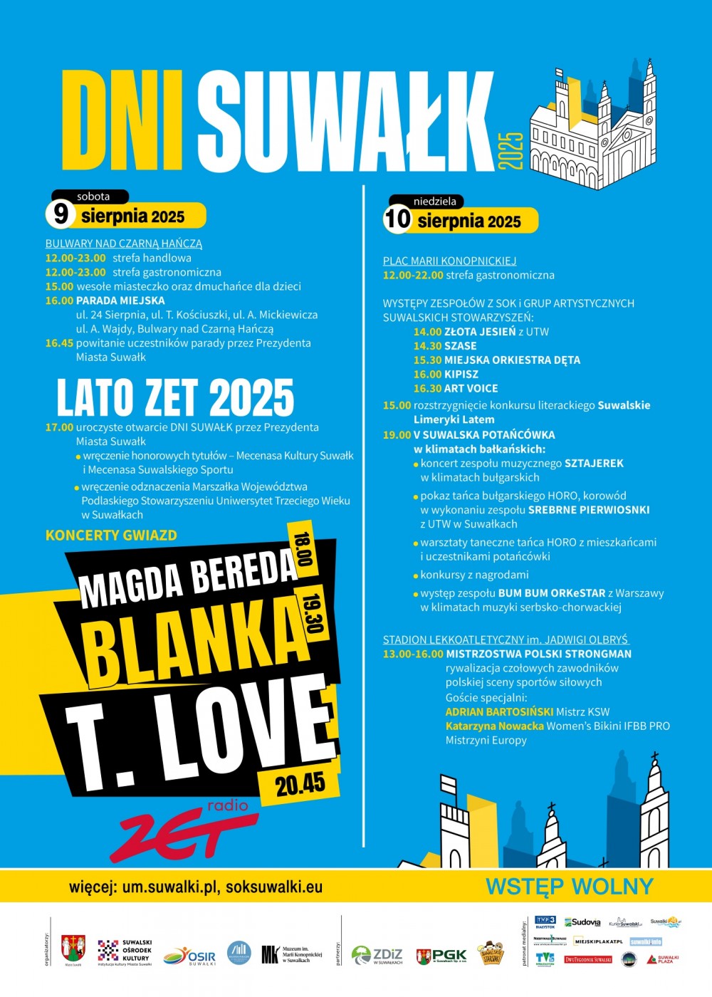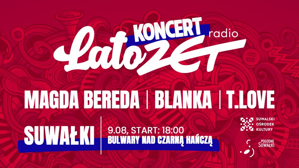Będzie można skorzystać ze strefy gastronomiczno – handlowej, kupić pamiątkę z Suwałk i zjeść coś pysznego. Najmłodszych zapraszamy do wesołego miasteczka, w którym nie zabraknie ciekawych gier i zabaw. Gwiazdami wieczoru w ramach koncertu LATA ZET będą T. Love, Blanka oraz Magda Bereda!