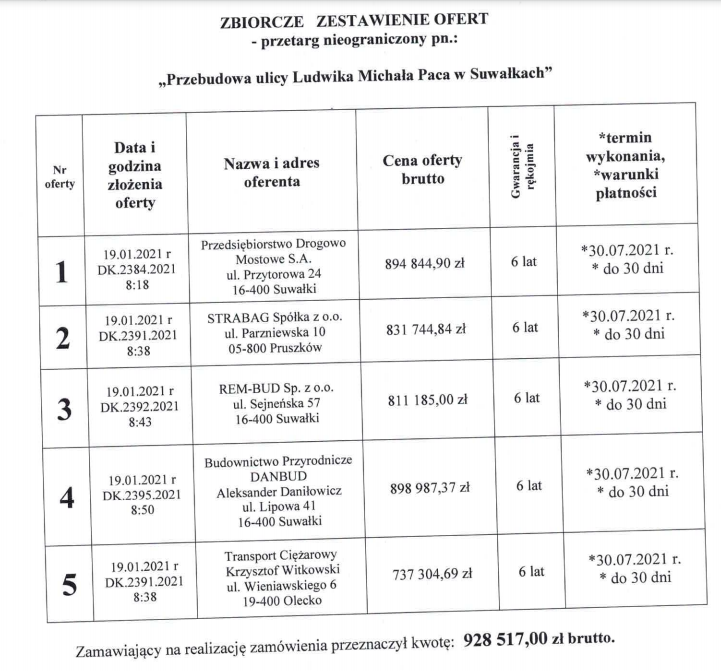 Podobnie jak w ubiegÅ‚otygodniowym przetargu na parkingi przy ul. Sportowej najniższÄ… kwotÄ™ zaproponowaÅ‚a firma Transport Ciężarowy Krzysztof Witkowski z Olecka. Na osiedlu PóÅ‚noc skoÅ„czyÅ‚a ona niedawno budowÄ™ drogi z rondem miÄ™dzy Reja a DaszyÅ„skiego, a przed ponad rokiem budowaÅ‚a parkingi przy tzw. wtórniku miÄ™dzy LityÅ„skiego a Kowalskiego.