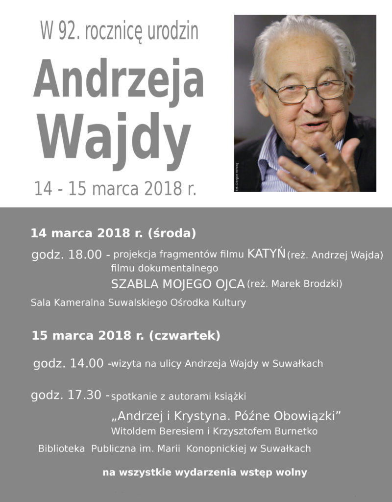 Suwalski Ośrodek Kultury zaprasza na dwudniowe obchody rocznicy urodzin wybitnego reżysera Andrzeja Wajdy. Urodzony w Suwałkach wybitny twórca filmowy 6 marca skończyłby 92 lata. W programie obchodów projekcja fragmentu filmu ,,Katyń” oraz pokaz filmu dokumentalnego ,,Szabla mojego ojca”, wizyta na ulicy Andrzeja Wajdy oraz spotkanie autorskie w Bibliotece Publicznej im. Marii Konopnickiej.