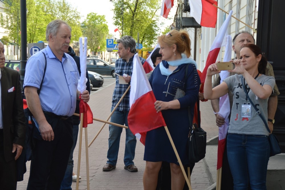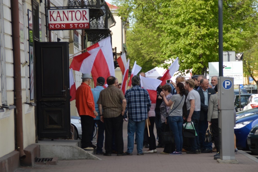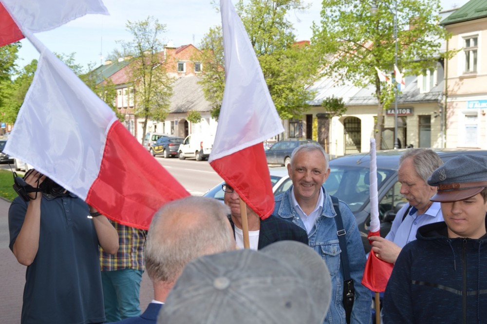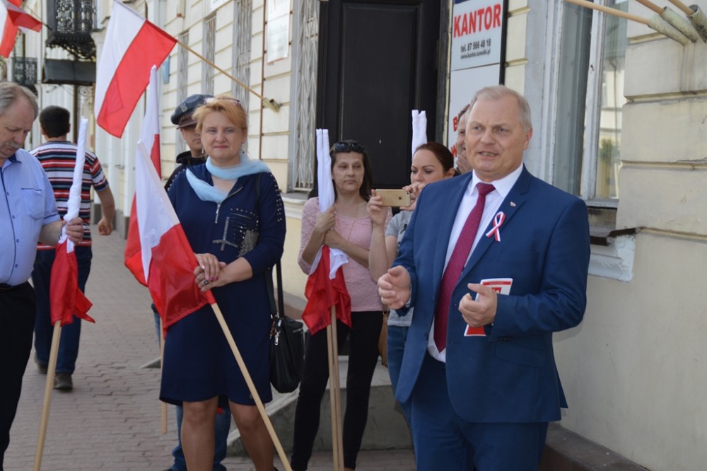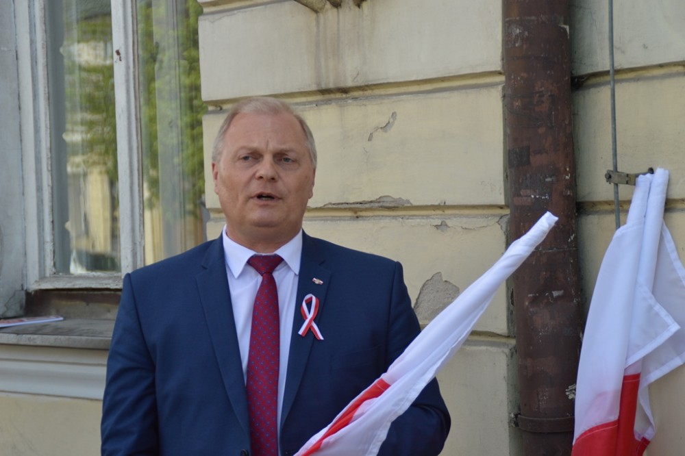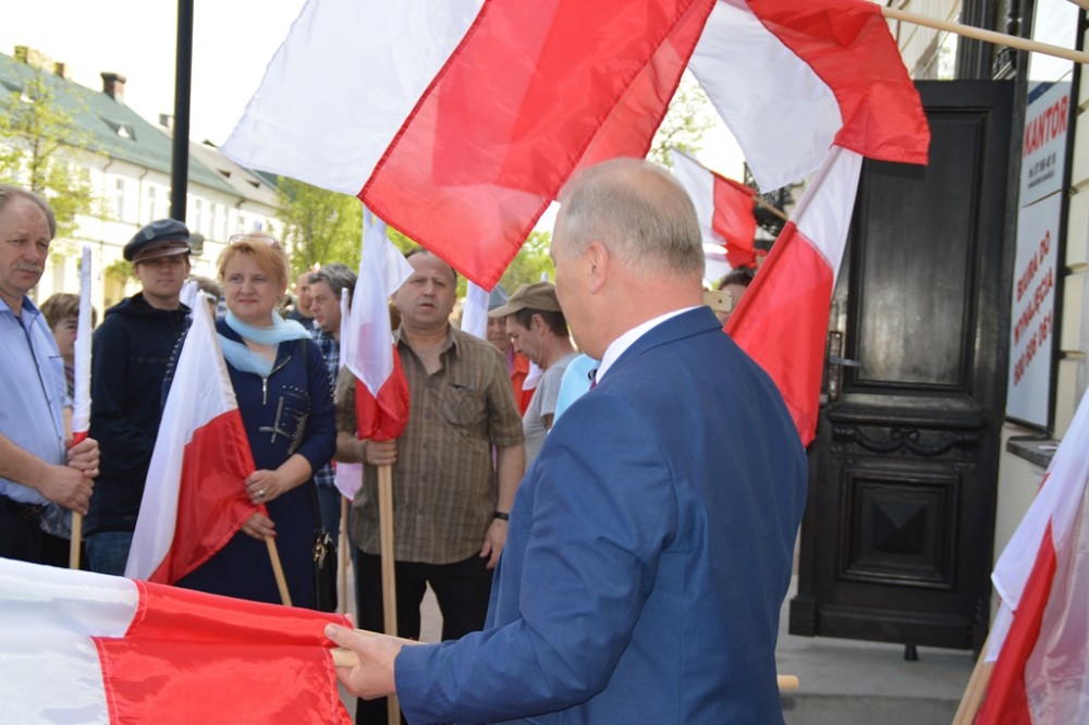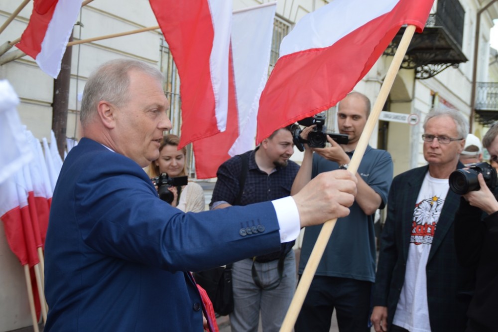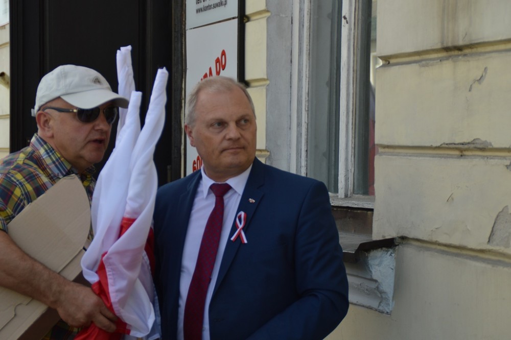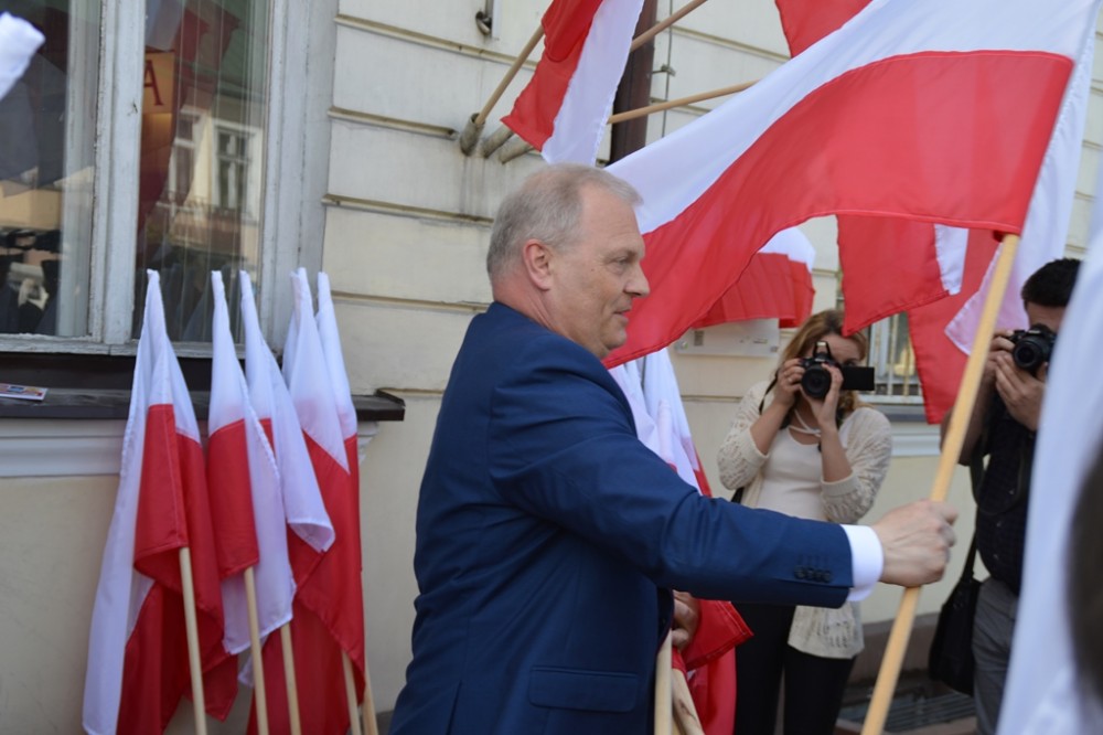 Tyle samo czasu zajęło wręczanie osadzonych już na drzewcu flag Lechowi Antoniemu Kołakowskiemu. Poseł Prawa i Sprawiedliwości debiutował w roli rozdającego symbole w Suwałkach. Kilka tygodni temu otworzył swoje biuro w kamienicy przy ul. Kościuszki 71.