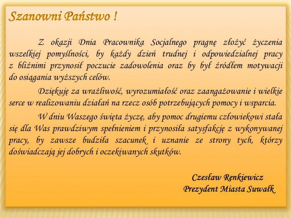 W Domu Pomocy Społecznej „Kalina” w Suwałkach obchodzono w środę Dzień Pracownika Socjalnego. Z tej okazji dyrekcja DPS`u zorganizowała spotkanie, podczas której podsumowano ostatni rok działalności „Kaliny”. W uroczystości wzięli udział między innymi Czesław Renkiewicz, Prezydent Suwałk z zastępcą Ewą Beatą Sidorek.