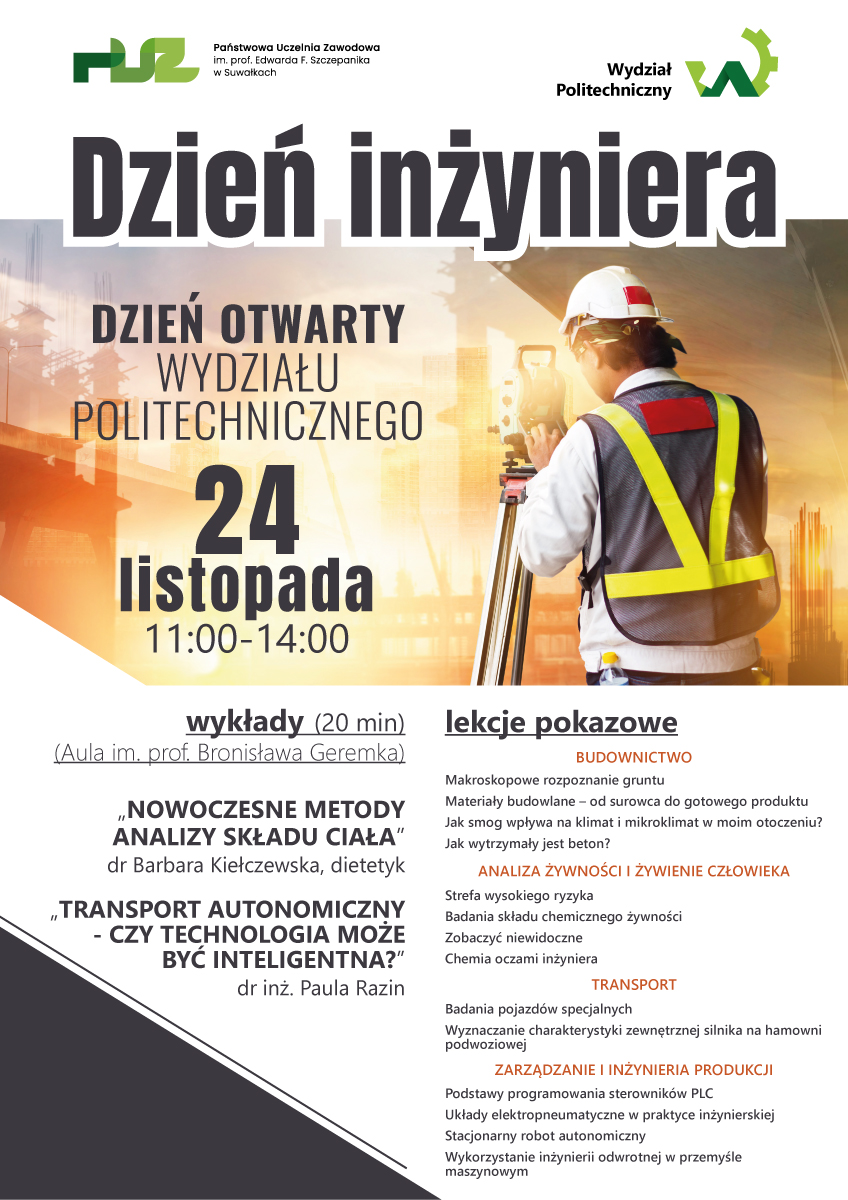 Praktyczne lekcje pokazowe oraz krótkie i niezwykle ciekawe wykłady czekają specjalnie na suwalską młodzież. Wszystko po to, by pokazać, jak fascynujący jest świat mechatroniki, budownictwa, transportu, czy żywności. 26 listopada w suwalskiej Uczelni odbędzie się Dzień Inżyniera (dzień otwarty Wydziału Politechnicznego).
