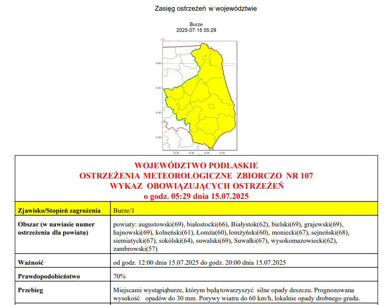 Białostockie biuro prognoz meteorologicznych IMGW-PIB wydało ostrzeżenie przed burzami, jakie mogą wystąpić dzisiaj w całym województwie od godz. 12:00 do 20:00.